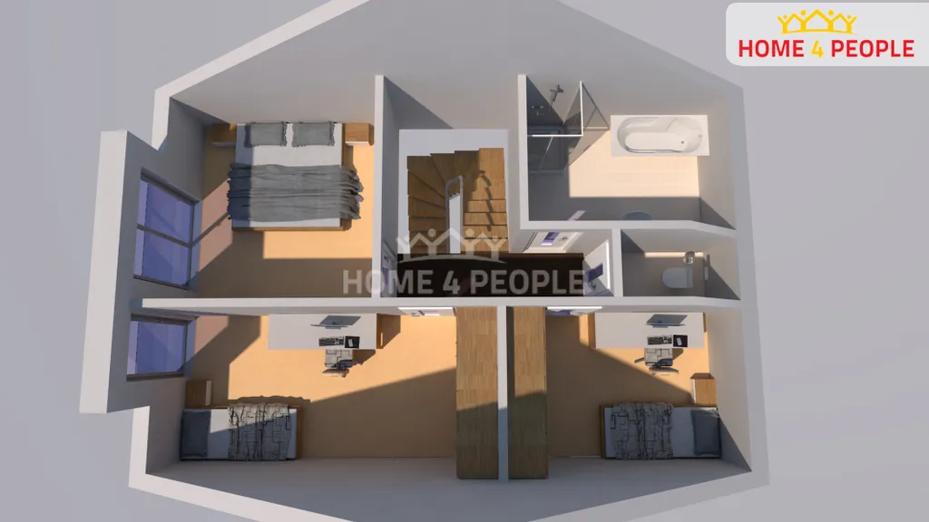 V přízemí se nachází prostorné zádveří (3,87 m²), které vás uvítá a provede do chodby (2,73 m²). Dále zde naleznete technickou místnost (2,34 m²) a velkorysý obývací pokoj s kuchyňským koutem (41,46 m²), ideální pro rodinné oslavy a společenské chvíle. Z obývacího pokoje je přístup na terasu (15 m²), kde si můžete užívat slunečné dny. Přízemí doplňuje praktické WC (1,65 m²). V druhém nadzemním podlaží se nachází chodba (3,86 m²) a tři ložnice – jedna (11,55 m²) a druhá (13,71 m²) pro pohodlné spaní, a třetí (9,66 m²), kterou lze využít jako pracovnu. Koupelna s vanou (7,4 m²) a samostatné WC (1,65 m²) zajišťují maximální komfort pro celou rodinu.