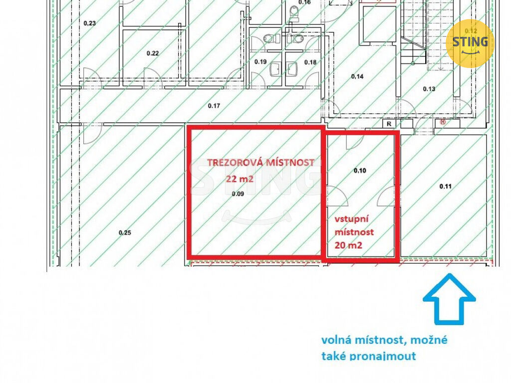 Trezor navazuje na vstupní místnost o velikosti cca 20 m2, která je také součástí pronájmu a umožňuje bezpečný vstup do trezoru.