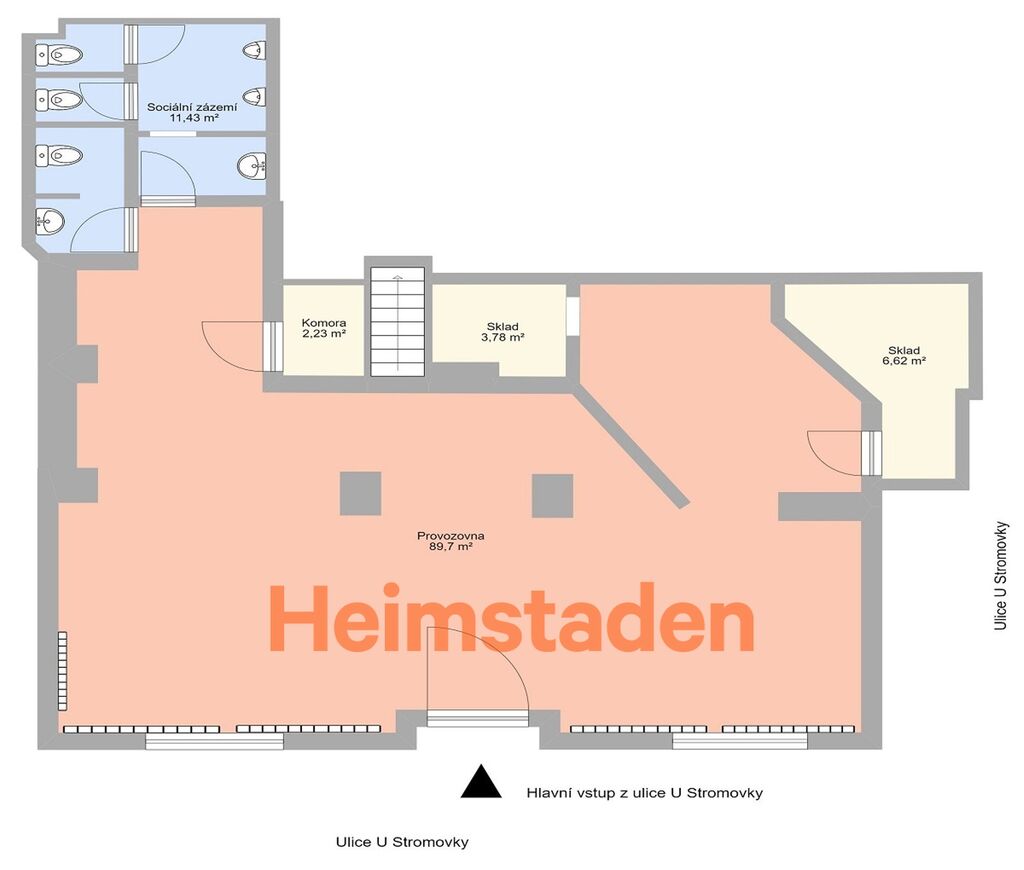 Prostor má vlastní vstup z ulice a velké výlohy, samozřejmostí je 3x sociální zázemí.