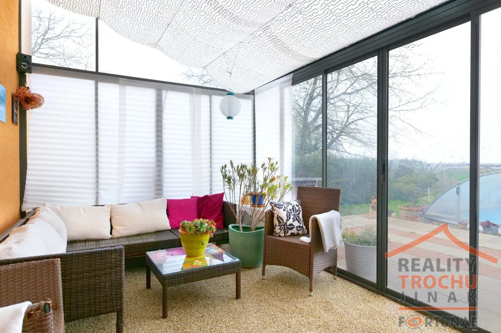 Dispozice: v přízemí je vstupní veranda, hala s vestavěnou skříní a úložným prostorem pod schody, technická místnost, prostorný obývací pokoj s kuchyní (46m2), koupelna se sprchovým koutem a toaletou, pracovna (pokoj). Z obývacího pokoje je francouzským oknem vstup do zimní zahrady a následně na terasu s krytým bazénem. Zimní zahrada se dá užívat i v zimě, je tam tepelný plynový zářič. Bazén se slanou vodou a filtrací je ohříván tepelným čerpadlem a má posuvné zastřešení.