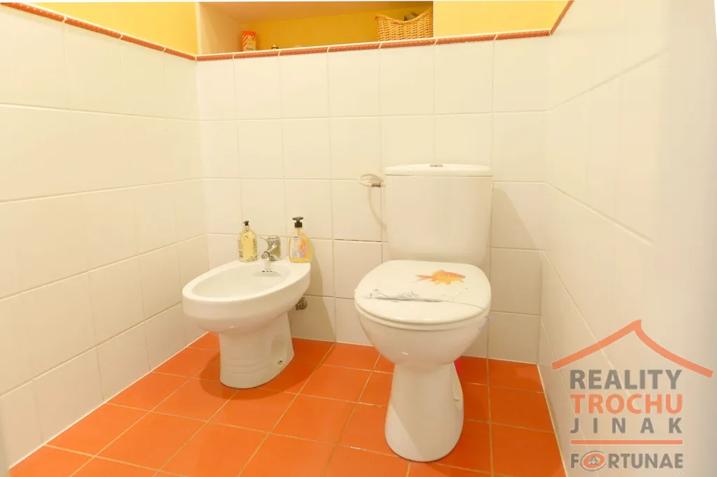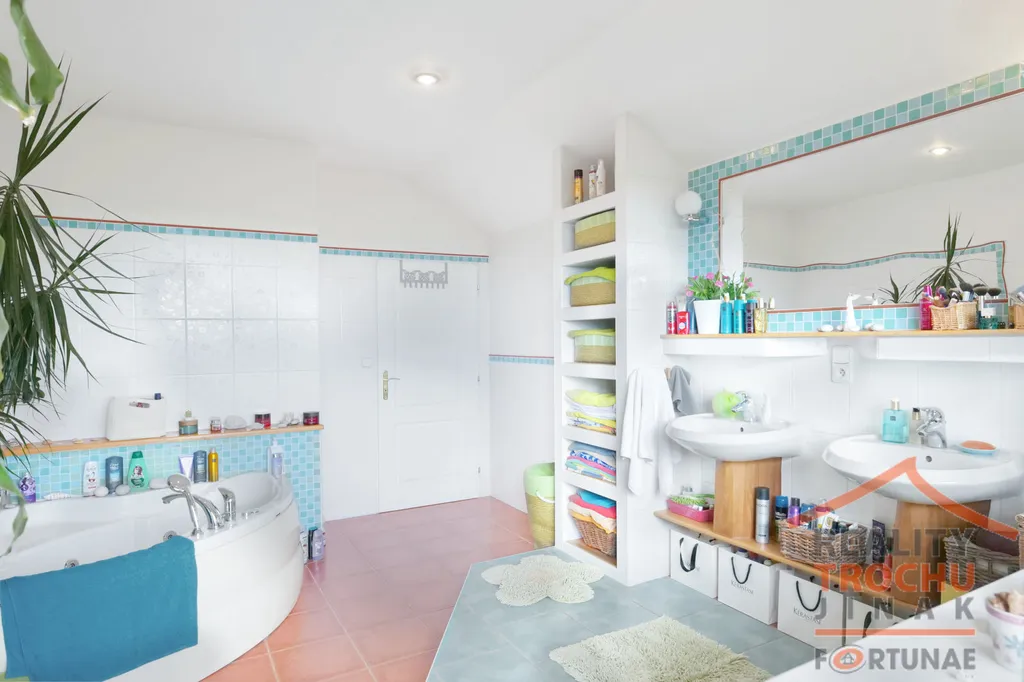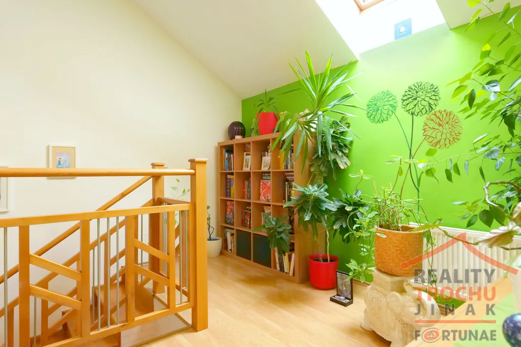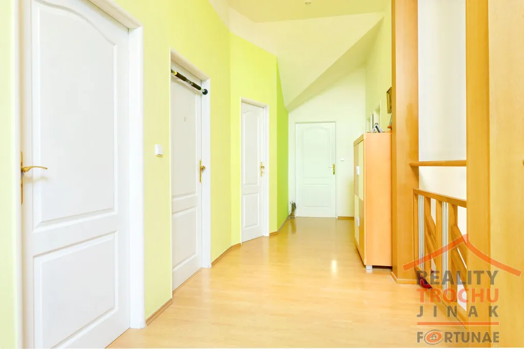 V patře je prostorná světlá chodba se šatnou, technickou místností, velkou koupelnou (13m2) s krásným výhledem na zahradu, rohovou masážní vanou a balkonem, ložnicí (18m2) se vstupem na balkon, a dále pokoj (33m2), ve kterém je vybudováno obydlené patro a balkon.