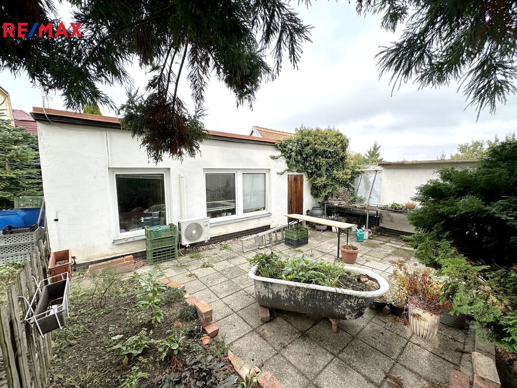 K dispozici pozemek o celkové výměře 673 m2 s hustě osázeným okrasnými keři, vytápěným skleníkem a kůlnou.