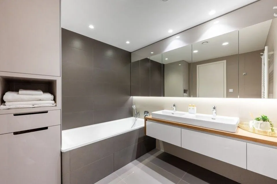 Za zmínku stojí designové osvětlení všech místností a nábytek na míru v provedení dub - lak v pudrovém odstínu, vyrobený dle návrhu interiérové designérky. V bytě je velké množství důmyslně řešených úložných prostor, s osvětlením uvnitř i vně. Kuchyňská linka je vybavena spotřebiči BOSCH nejvyšší třídy, indukční varná deska má integrované odsávání. Osvěžující komfort nabízí americká lednice s ledovačem nebo vestavěná vinotéka. Pracovní deska kuchyňské linky je z umělého kamene Corian.