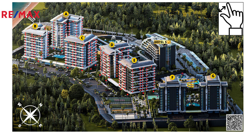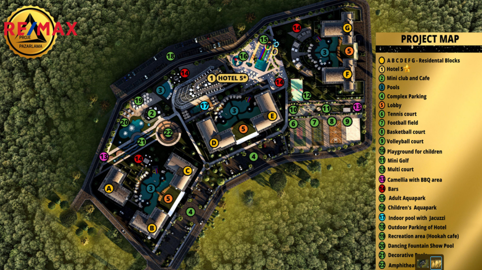 Představují byt v unikátním luxusním komplexu, který se nachází v chráněné oblasti, uprostřed jehličnatého lesa, nedaleko růžové písečné pláže. V okrese Avsalar na severu Alanye v Turecku a je považován za jednu z nejkrásnějších oblastí. Projektová oblast zajímá - 52.000 m2 se vzdáleností k moří - 900 m. Začátek stavby - 30.06.2023 a konec 30.09.2025 roku.