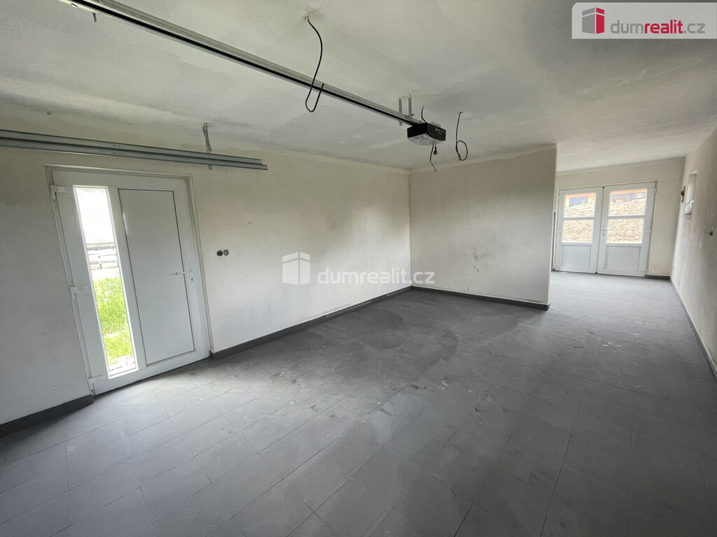 Vedle domu stojí garáž (45 m²) s přípravou na vodu, elektřinu i odpady. Součástí jsou sádrokartonové podhledy, venkovní fasáda, část podlahy s dlažbou a plastová okna a dveře. Pozemek je částečně oplocen.