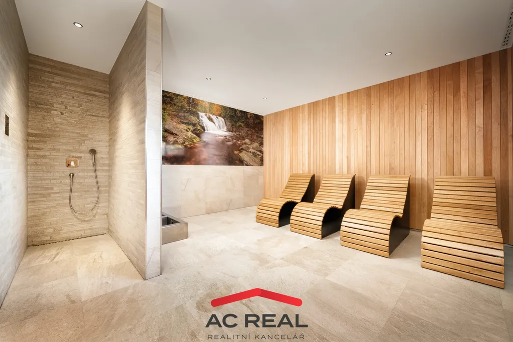 Ve spodním patře apartmánu se nachází jedna ze dvou koupelen, velký obývací pokoj s kuchyňským koutem umístěným v nice s přístupem do lodžie a jedna z ložnic. Do druhého patra se vstupuje po mlynářských schodech (utváří dojem, že jste na chalupě) na otevřenou galerii, ideální relax zóna s možností dalších lůžek, ze které je přístupná druhá koupelna a další 2 ložnice, respektive 3, jen ta třetí je pro skřítky. Součástí tohoto apartmánu je totiž prostor o 54,6 m2 s nižší výškou do stropu, který není započten do celkové podlahové plochy a v půdorysu je označen jako prostor úložný. O váš maximální komfort se postará podlahové topení a rekuperace.