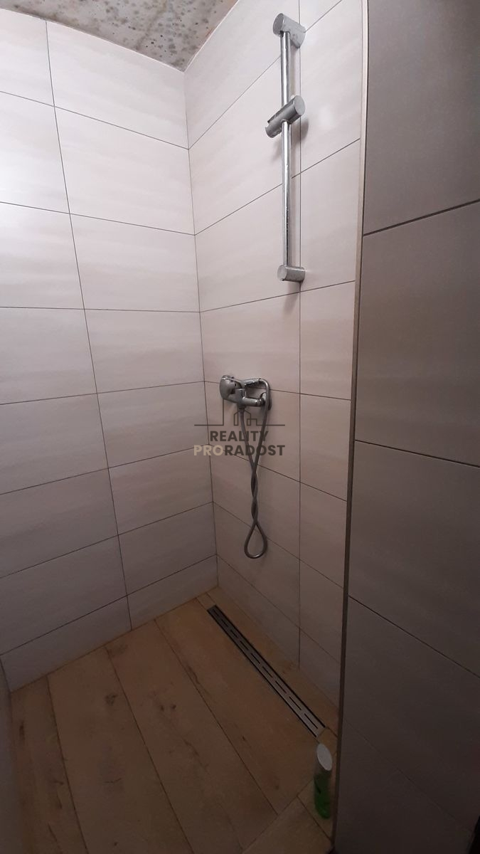 Koupelna je po zdařilé rekonstrukci a je umístěna společně s toaletou mimo byt - na chodbě.