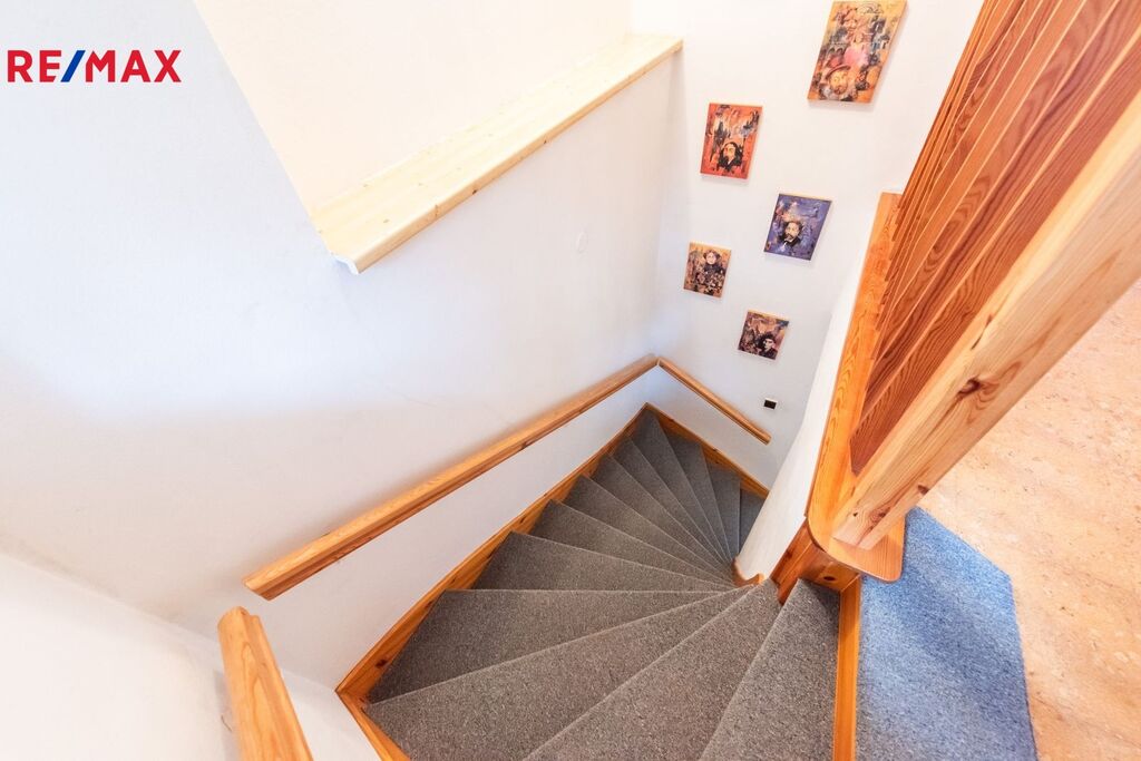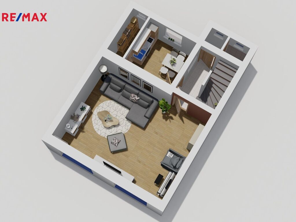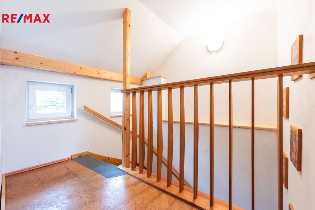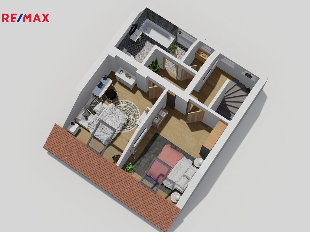 2. NP je centrálně tvořeno chodbou ze které se vstupuje samostatně do všech ostatních místností na patře, tzn. do obývacího pokoje, do kuchyně jejíž součástí je samostatná místnost určená k uskladnění potravin, na samostatné WC a také na terasu na kterou volně navazuje zahrada, která poskytuje dostatek soukromí a výhled na historické dominanty města.