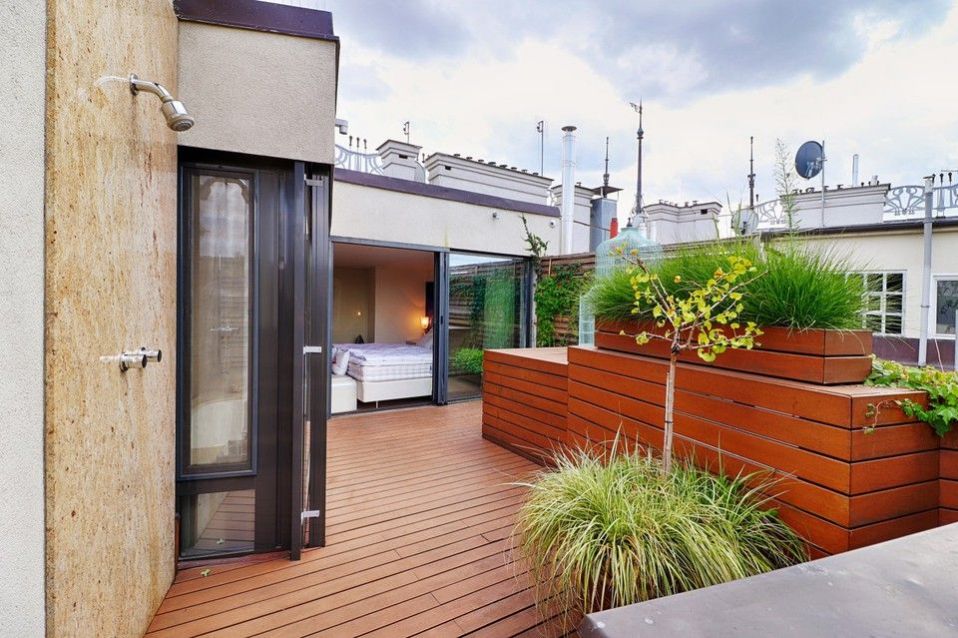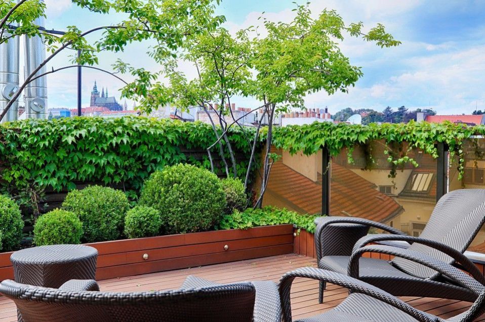 K nákladnému luxusnímu vybavení náleží kuchyňská linku v bílém designu s italskou mramorovou deskou vybavenou spotřebiči Miele, indukce, elektrická trouba, dvě vinotéky, spížka pro potraviny, klimatizace v celém bytě, mikroventilace v šatně, podlahy z masivu, luxusní plynový krb, sanita Antonio Lupi, BMI centrální ovládací systém, obklady italským Traventinem, dřevěné obložení stěn, diamantové bezpečnostní sklo, kamerový systém, designové osvětlení různého druhu, lampy z Muranského skla, bezpečnostní trezorové dveře s protipožární vložkou. K historii budovy odkazuje budoár s původními dřevěnými trámy umístěný ve věži s fascinujícími výhledy. Obložení terasy teakovým dřevem, přítomnost zeleně dle zahradního architekta, celá terasa vybavena samozavlažovacím systémem s dešťovým čidlem, venkovní letní kuchyně v nerez a dřevěném provedení kuchyně, sprcha, venkovní nábytek DEDON. Elektricky výsuvná markýza s dešťovým a větrovým čidlem. Principy Feng Shui v celé koncepci bytu. Inteligentní domácí systém, bezpečnostní okenní folie a bezpečnostní žaluzie nejvyšší kategorie. Exkluzivní a žádaná lokalita staré Prahy v Pařížské ulici nabízí veškerou občanskou vybavenost, s mnoha luxusními obchody, prestižními restauracemi a kavárnami na dosah.