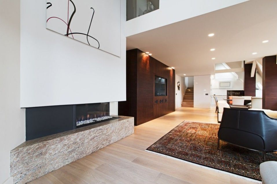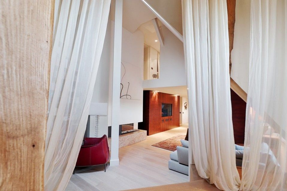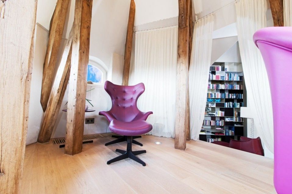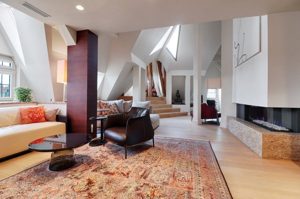 Interiér vyššího podlaží je tvořen obývacím pokojem, kuchyní, 2 ložnicemi, pracovnou, 2 koupelnami, samostatnou toaletou a halou. Nižší podlaží se skládá disponuje dvěma pracovnami, s terasou s letním posezením a neopakovatelnými, jedinečnými výhledy na Pražský hrad, en-suite koupelnou a šatnou, komory a galerie. Kupní cena zahrnuje veškeré luxusní vybavení. Privátní výtah přímo do bytu.