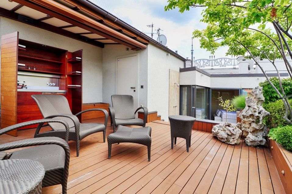 Výjimečný mezonetový byt 252 m2 k pronájmu po nákladné kompletní rekonstrukci s unikátní, střešní terasou 42,5 m2 a neopakovatelnými výhledy na staré město včetně panoramatického pohledu na Pražský hrad v 6.podlaží noblesního činžovního domu s výtahem na prestižní adrese v historickém centru Prahy, v ulici Pařížská, pár kroků od Vltavského nábřeží, Staroměstského náměstí, Národního divadla či Karlova mostu a pouhou jednu zastávku tramvají od stanice metra Staroměstská.