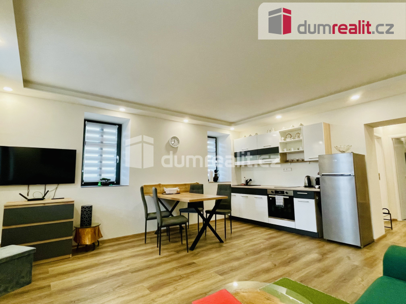 Dumrealit.cz Vám zprostředkuje prodej tohoto krásného apartmánu, který je v bytovém domě v krušnohorském středisku Abertamy, v původní, zastavěné části města. Jedná se o apartmán v přízemí domu, který byl nově komplexně zrekonstruován a vybaven. Dispozice bytu je 2+KK o velikosti 46,4 m². Celoplošné podlahové vytápění a ohřev vody je zajištěno vlastním elektrokotlem. Apartmán je vhodný pro 4 osoby. Součástí ceny bytu je jeho vybavení. K bytu náleží také uzamykatelná sklepní kóje o velikosti 1,7 m². Společné parkování pro všechny vlastníky ve dvoře.