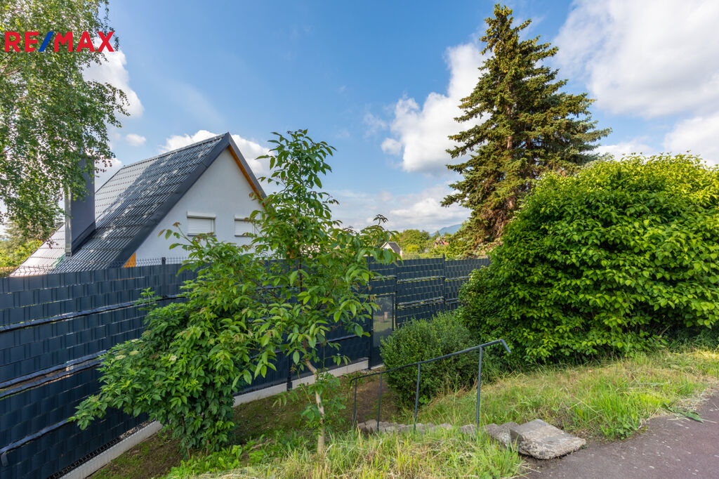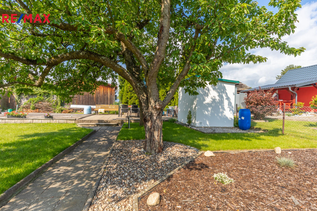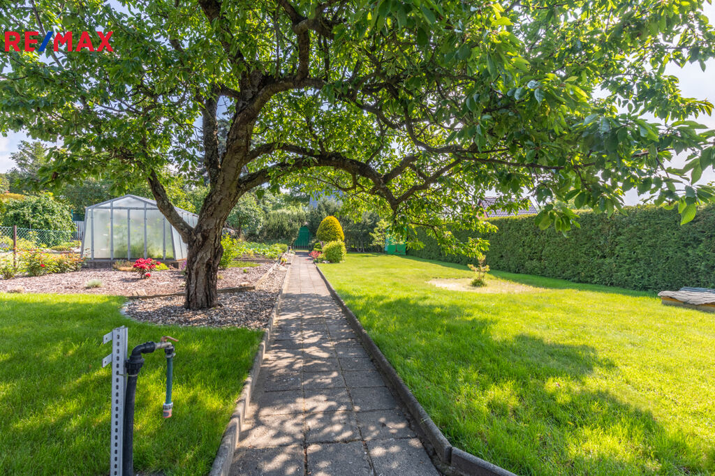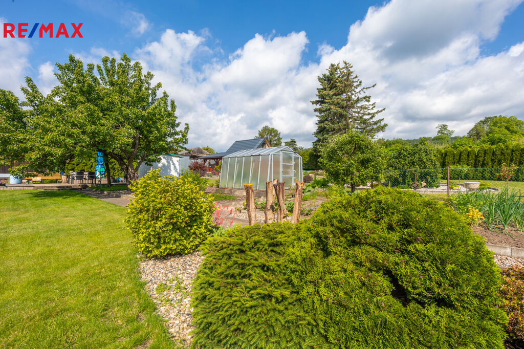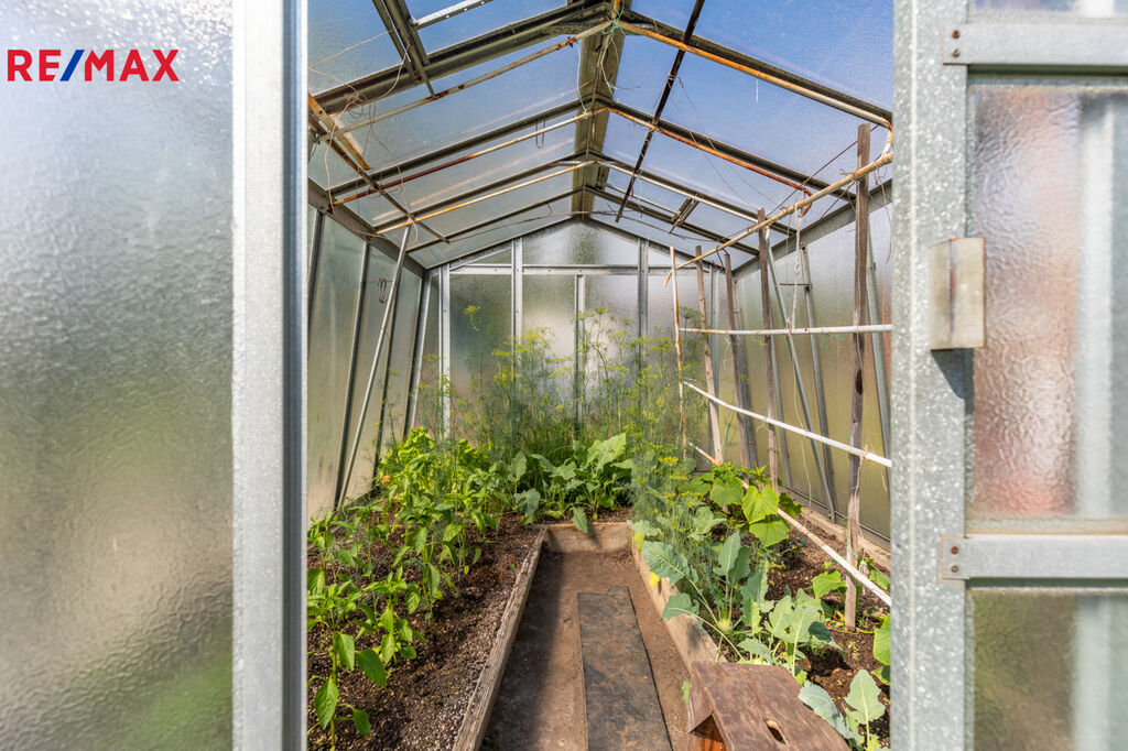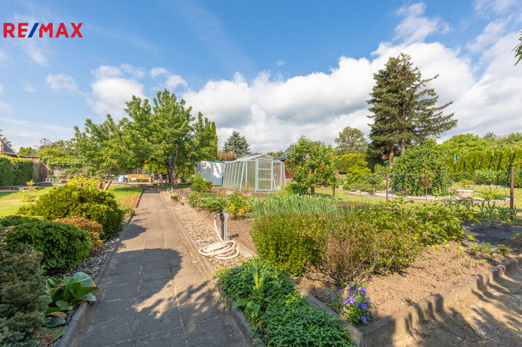 Zahrada je ideální nejen pro rekreaci a každodenní relaxaci celé rodiny, ale také pro nadšené pěstitele. Skleník o rozměrech 3 x 2,5 m ocení každý zahrádkář. Na zahradě rostou okrasné keře a plodící ovocné stromy jako třešeň, jabloň, broskvoň a slíva. Jsou zde také založené záhonky pro pěstování zeleniny, rajčat a dalších plodin. Zatravněná plocha je pravidelně udržována a opečovávána, což vytváří krásný zahradní koberec. V rohu zahrady se nachází zahradní plastová buňka s chemickým WC.
