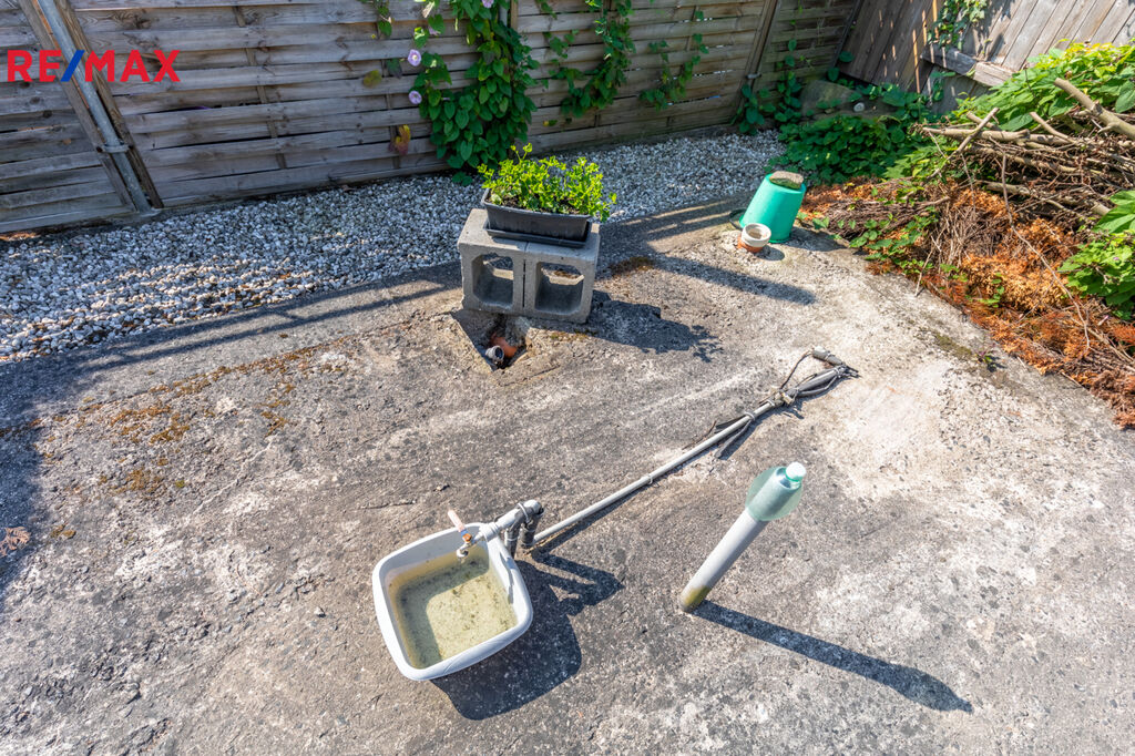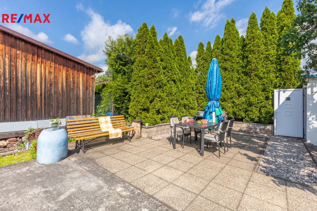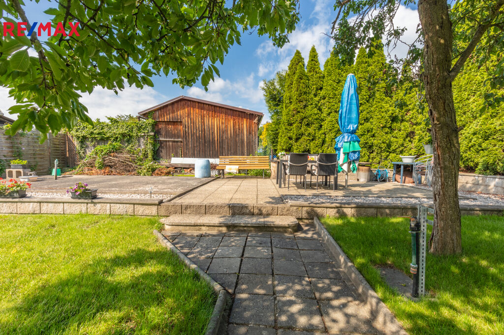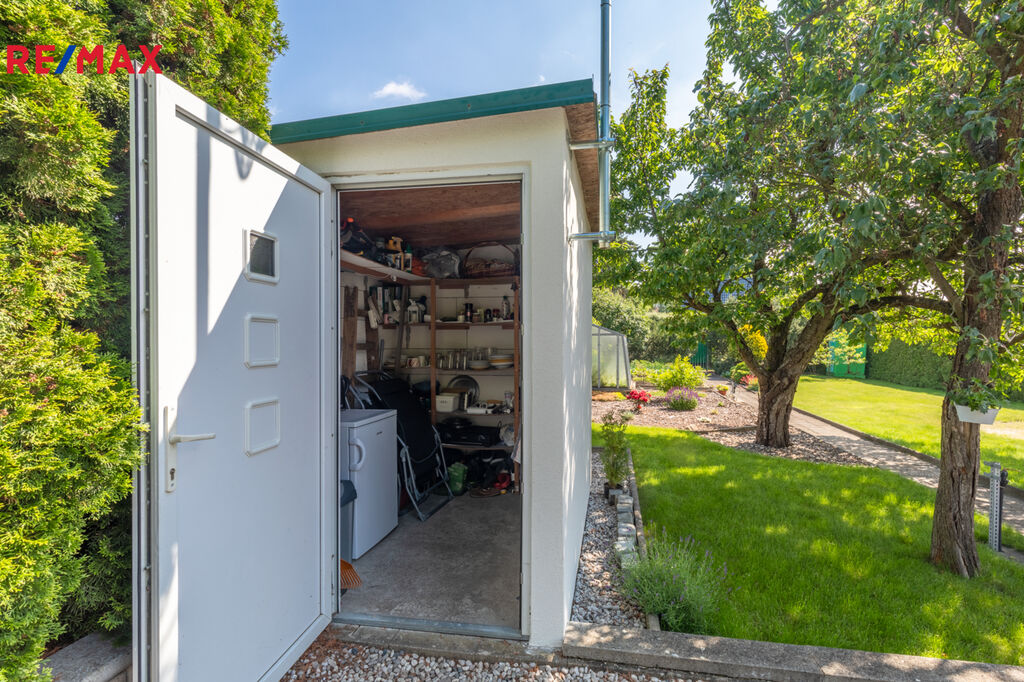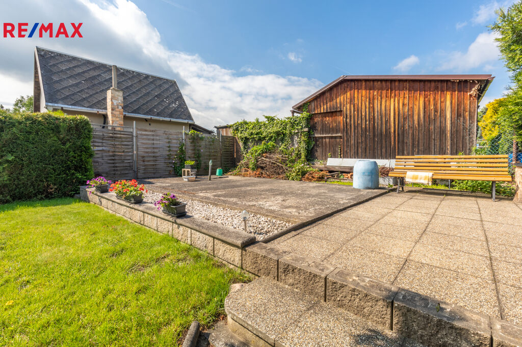 V krajní části zahrady je postaven zděný zahradní domek na úschovu zahradního nábytku či nářadí o velikosti 2 x 2,5 m (z Itongu) pod stálým uzamčením kvalitních plastových dveří. Velkým bonusem této nabídky je již existující základová deska s rozměry 6 x 4 m, která jen čeká na výstavbu zahradní chatky budoucím majitelem. Zde je připraven i vývod vody, elektřiny a odpadu do 200 litrové nádrže. Bez přímé příjezdové komunikace.