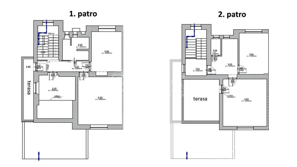 V 2NP jsou 2 pokoje, samostatná místnost kuchyně a koupelna s WC, menší terasa, celkem 81,3 m2.