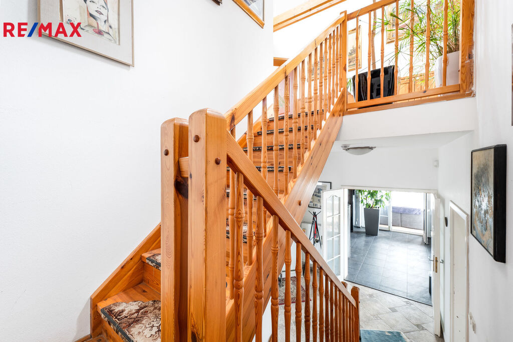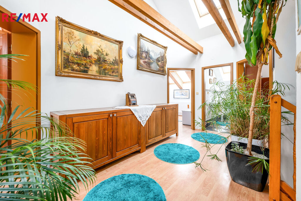 1.patro - na konci schodiště je hala, odtud vstup do hlavní koupelny s vanou a sprchovým koutem, jedna ložnice se vstupem na balkon a druhá ložnice je také se vstupem na balkon, třetí ložnice je upravená na posilovnu se saunou, vedle je samostatné WC. Celkem je v domě 9 místností, dvě koupelny, zimní zahrada.