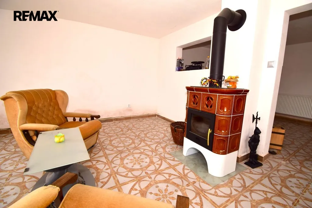 Z kuchyně je velký prostup do obývacího pokoje s krbovými kamny.