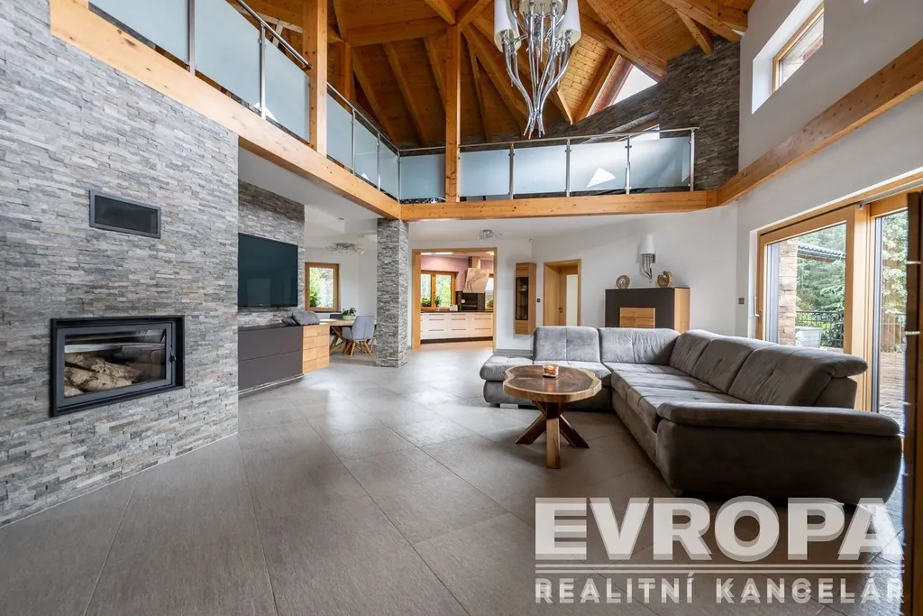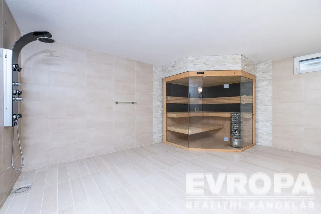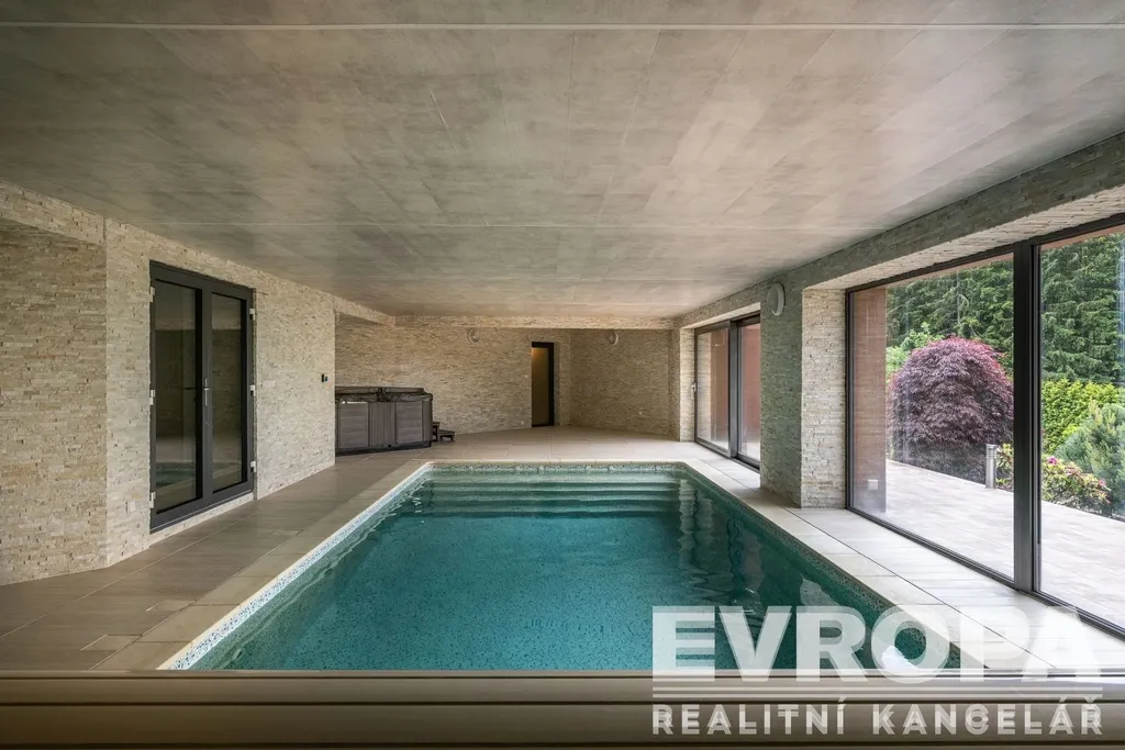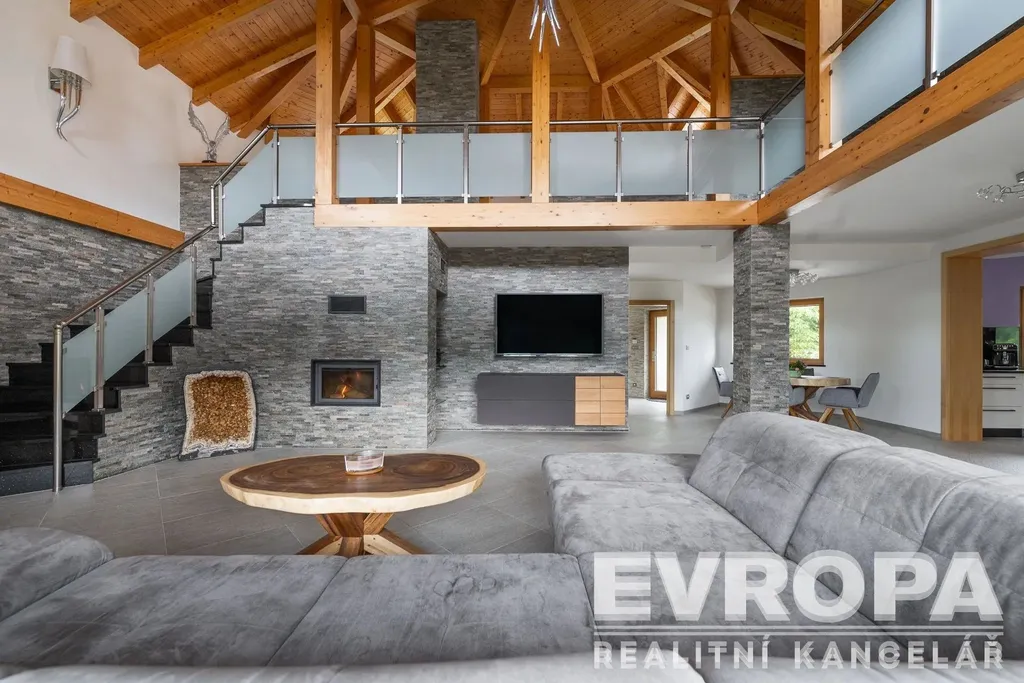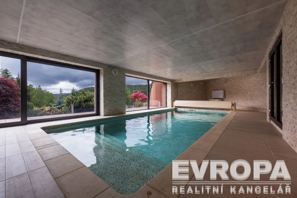 Otevřené patro galerie s ložnicí a vlastní koupelnou nabízí ničím nerušený výhled do okolní krajiny. Pro relaxaci je tu domácí wellness s bazénem 4x10 m, saunou s odpočívárnou a vířivkou výhledem do údolí, klubovna. Ať už hledáte únik před stresem každodenního života, nebo místo pro setkávání s přáteli, toto sídlo vám poskytne obojí.