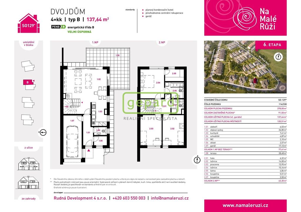 Realitní společnost Gepard nabízí prodej zděného rodinného domu o velikosti 4+kk o užitné ploše 140 m2 (včetně garáže) s terasou 28 m2 a pozemkem o ploše 378 m2. Jedná se o součást 6. fáze projektu "Na Malé Růži" v rozvíjející se lokalitě Drahelčice, Rudná u Prahy, která navazuje na zastavěnou oblast ulic U Potoka, Na Malé Růži, Husova, Karla IV., Kotoučova, Císařská. Nově vznikající etapa je umístěna mezi ulicemi Na Malé Růži, Jana Nepomuckého, Ke Hřišti. Projekt zahrnuje 40 domů energetické třídy A a B.