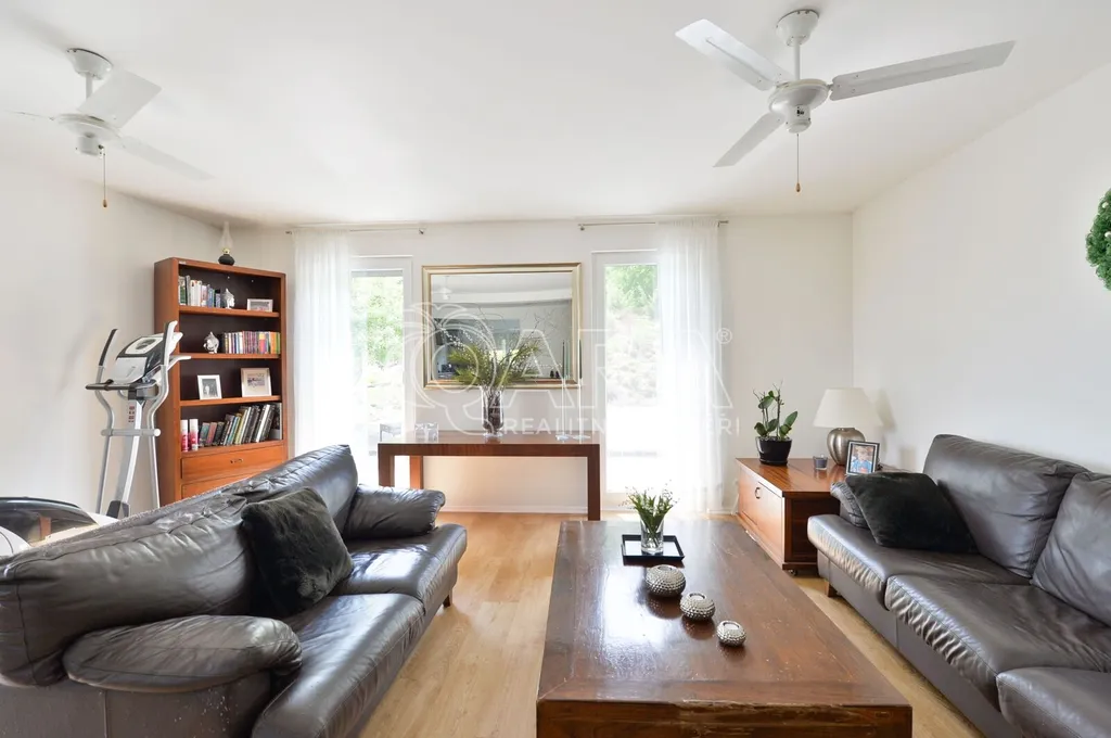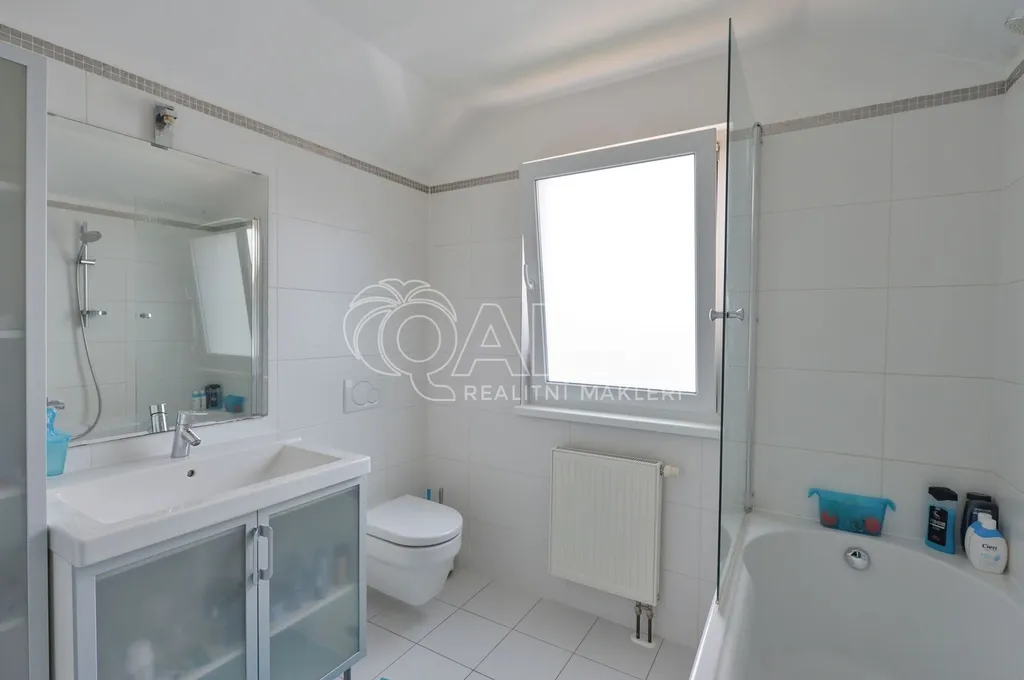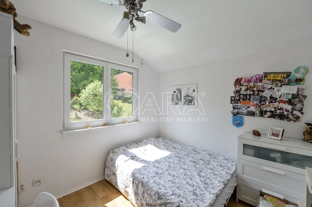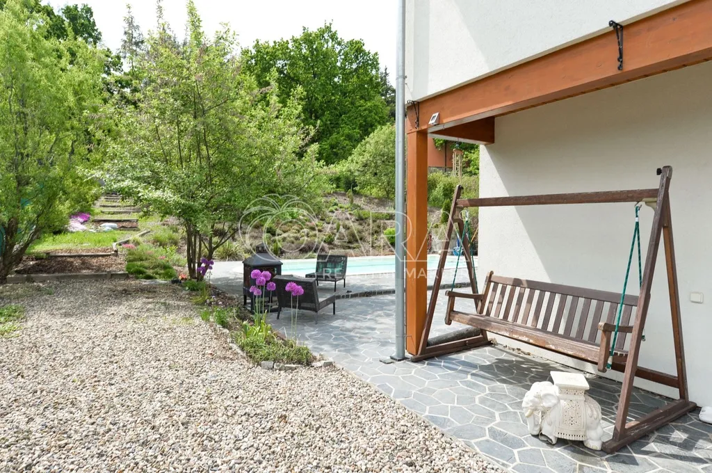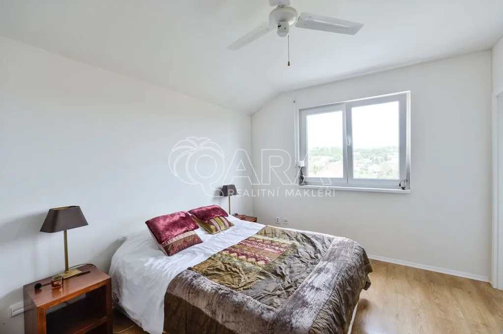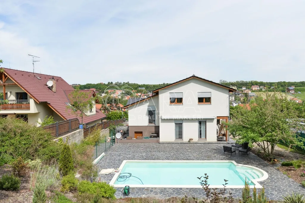Nabízíme rodinný dům ve vyhledávané obci Tuchoměřice jen pár minut od Prahy 6 a letiště s pozemkem ve svahu navazujícím na les. Dům byl stavěn na klíč v nadstandardním provedením a s množstvím individuálních úprav. Kolaudace proběhla v roce 2009. V přízemí se nachází velkorysý obytný prostor spojený s jídelnou a kuchyní, u kuchyně je spíž. Moderní kuchyňská linka je kompletně vybavena vestavěnými spotřebiči. Z obývacího pokoje je výstup přímo na terasu s bazénem před domem. V mezipatře se nachází dva pokoje a prostorná koupelna se sprchovým koutem a toaletou. Ve druhém patře jsou tři ložnice, z nichž každá má vlastní koupelnu. Také je zde šatna a technická místnost s místem pro pračku a sušičku. Na podlahách jsou kvalitní laminátové plovoucí podlahy, dlažba a schodiště jsou dřevěná. Vytápění je řešeno plynovým kotlem, který je umístěn v suterénu vedle garáže. Na zahradě byl vybudován bazén o velikosti 8x4 m. Obec Tuchoměřice nabízí základní občanskou vybavenost. V místě je pošta, lékaři, mateřská škola a první stupeň základní školy. Přes obec vede cyklostezka. Bezproblémové je i spojení MHD na metro A Bořislavka 25 min. Letiště Václava Havla 10 min.