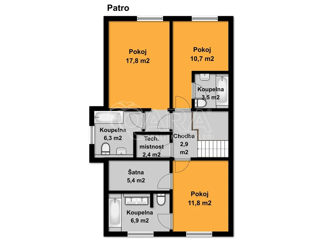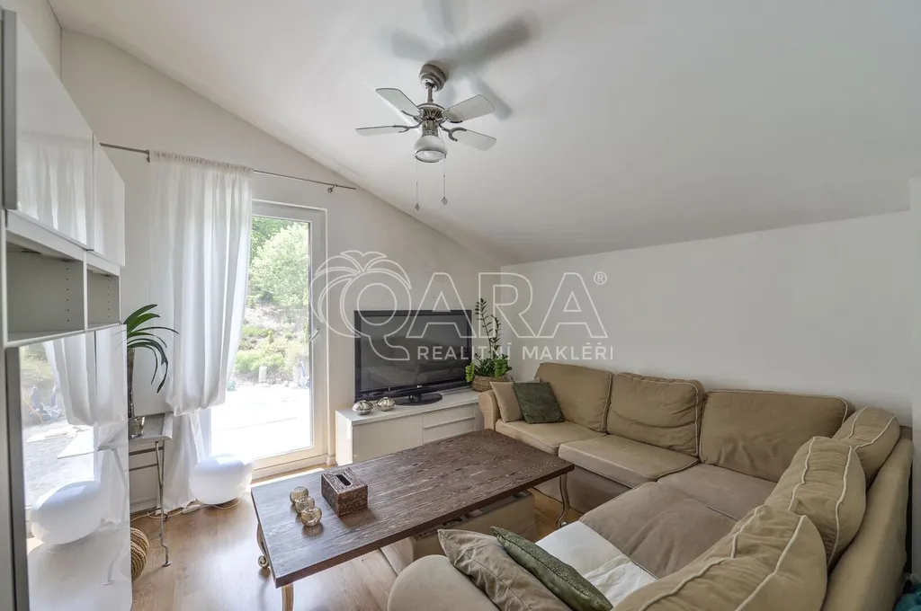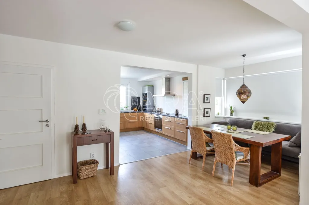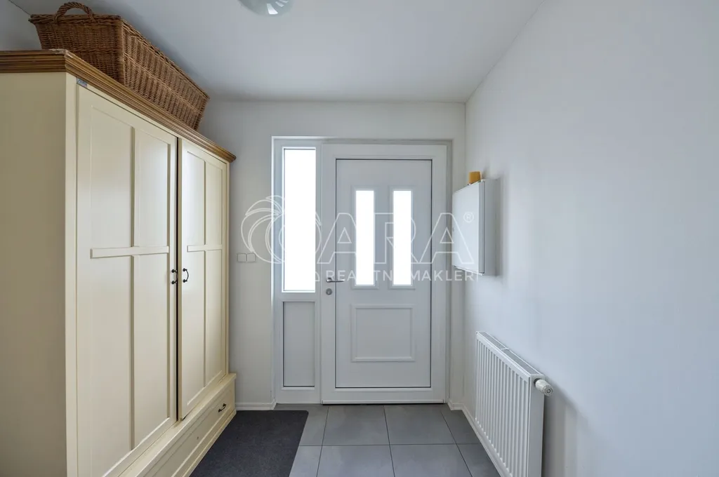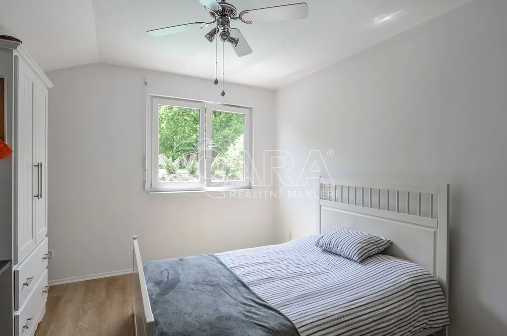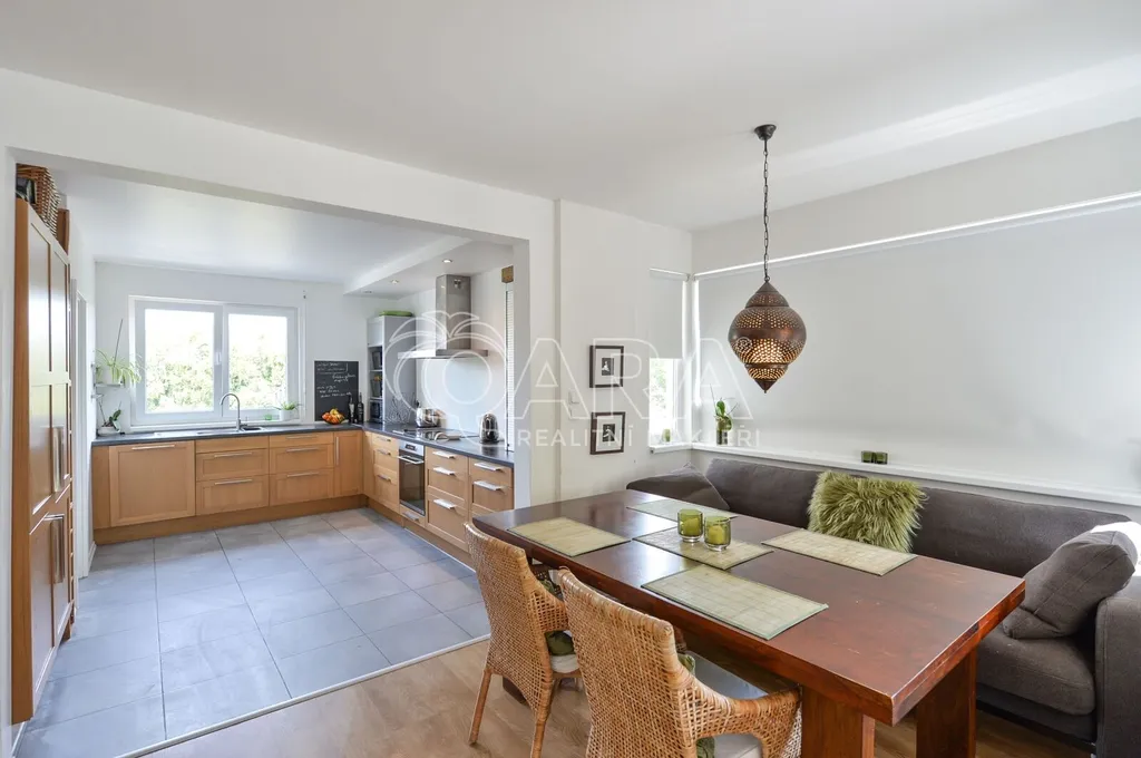 Nabízíme rodinný dům ve vyhledávané obci Tuchoměřice jen pár minut od Prahy 6 a letiště s pozemkem ve svahu navazujícím na les. Dům byl stavěn na klíč v nadstandardním provedením a s množstvím individuálních úprav. Kolaudace proběhla v roce 2009. V přízemí se nachází velkorysý obytný prostor spojený s jídelnou a kuchyní, u kuchyně je spíž. Moderní kuchyňská linka je kompletně vybavena vestavěnými spotřebiči. Z obývacího pokoje je výstup přímo na terasu s bazénem před domem. V mezipatře se nachází dva pokoje a prostorná koupelna se sprchovým koutem a toaletou. Ve druhém patře jsou tři ložnice, z nichž každá má vlastní koupelnu. Také je zde šatna a technická místnost s místem pro pračku a sušičku. Na podlahách jsou kvalitní laminátové plovoucí podlahy, dlažba a schodiště jsou dřevěná. Vytápění je řešeno plynovým kotlem, který je umístěn v suterénu vedle garáže. Na zahradě byl vybudován bazén o velikosti 8x4 m. Obec Tuchoměřice nabízí základní občanskou vybavenost. V místě je pošta, lékaři, mateřská škola a první stupeň základní školy. Přes obec vede cyklostezka. Bezproblémové je i spojení MHD na metro A Bořislavka 25 min. Letiště Václava Havla 10 min.