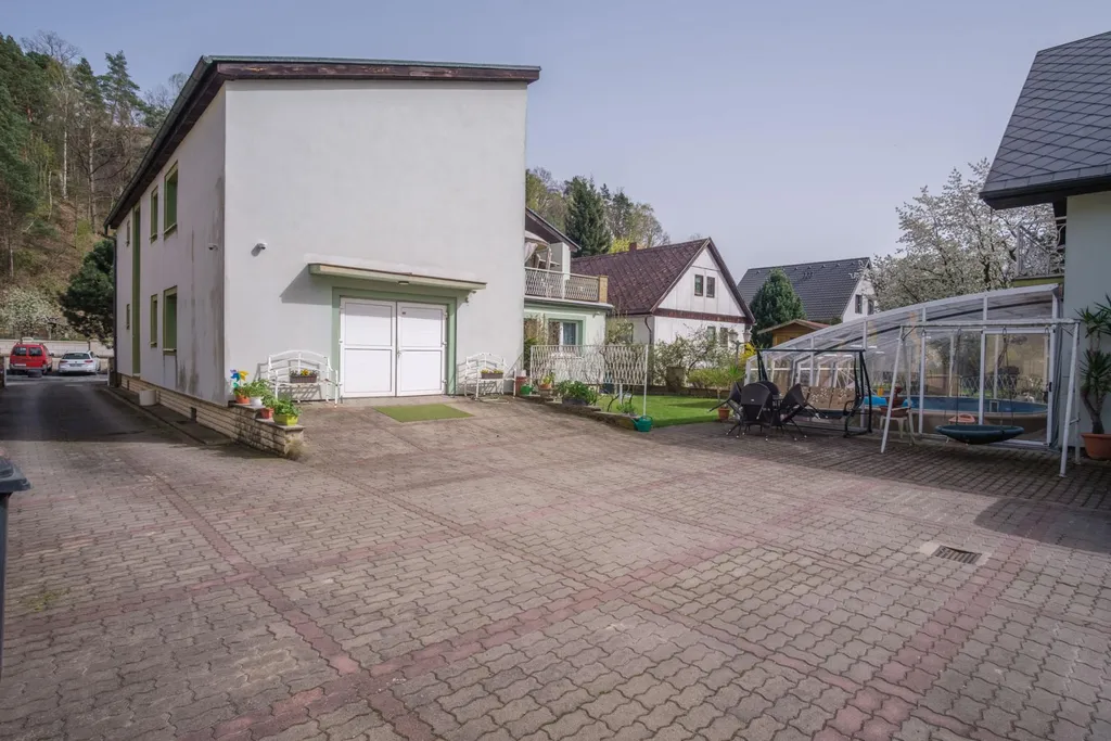 Dům disponuje menší předzahrádkou, za domem posléze naleznete opravdu prostorné nádvoří, kde lze zaparkovat několik osobních vozů. K domu navíc náleží ještě menší zadní domek, který má u sebe dvougaráž a v horním patře pak samostatnou bytovou jednotku v dispozici 2+kk o podlahové ploše cca 66 m2. Navíc je vedle tohoto menšího návštěvního domku také druhá přístavba, další garáž pro osobní vůz. Na pozemku naleznete navíc také posezení pro letní grilování, psí kotec a také zhruba 5metrový krytý bazén.
