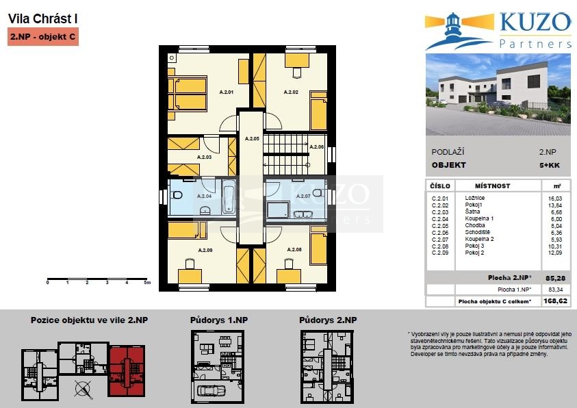 Po schodišti do prvního patra, jsou čtyři samostatné pokoje, koupelna se sprchovým koutem a toaletou. Komfort hlavní ložnice navíc ještě umocňuje navazující koupelna s vanou a toaletou a dále také oddělená šatna.