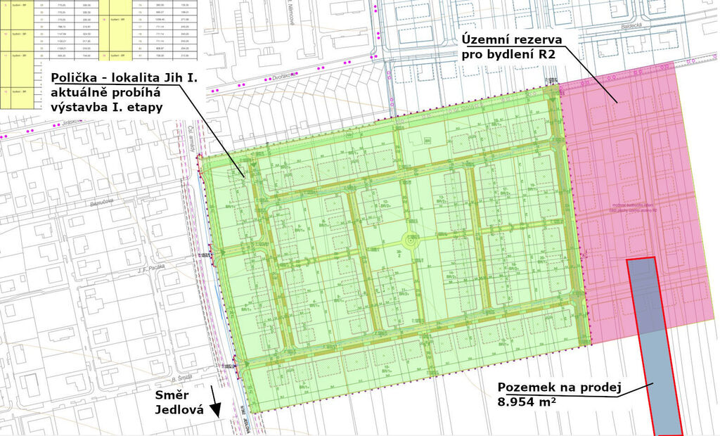 Lokalita má velký potenciál růstu, část polí v okolí již byla městem odkoupena, zasíťována a rozprodána k výstavbě rodinných domů po obou stranách silnice. Severní část nabízené parcely leží v oblasti "územní rezervy R2", která je součástí územní studie "Polička - lokalita jih I.", v jejímž rámci se počítá s výstavbou rodinných domů i na této části nabízené parcely.