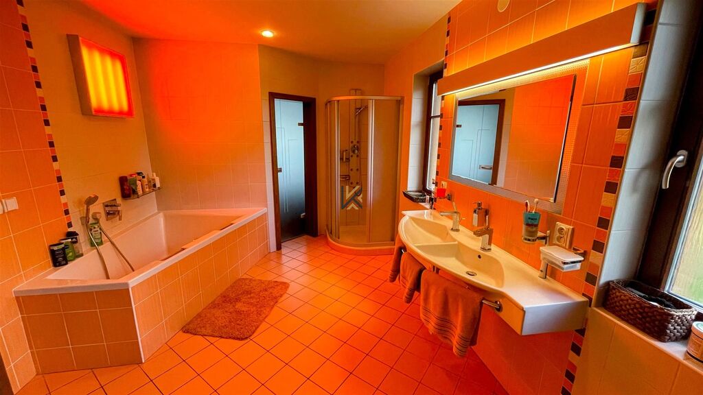 V 1.NP se nachází zádveří, samostatná místnost na boty, WC s prádelnou, vestavěné šatní skříně, velký obývací pokoj s kuchyňským koutem a spíží (79m2), ložnice, šatna, koupelna s WC a prostorem pro saunu. Dále prostorná dvougaráž a technická místnost.