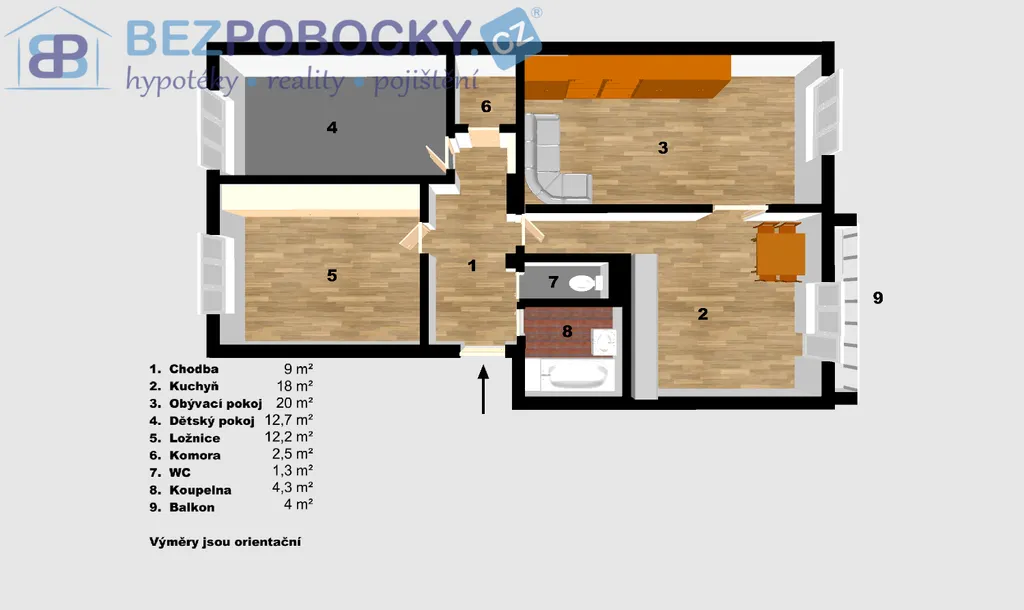 Užitná plocha bytu je 80 m² s balkonem 4 m² a krásným výhledem do krajiny na Pálavu. Orientace obývacího pokoje a kuchyně s balkonem na jih směrem k zahrádce. Další dva pokoje na sever jsou také s výhledem do krajiny.