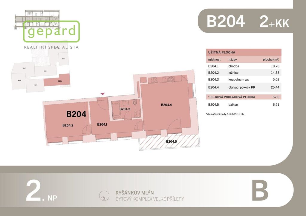 Realitní společnost Gepard nabízí k prodeji byt v OV 2+kk, 57,4m2 (byt č. B205) v developerském projektu Ryšánkův mlýn ve Velkých Přílepech  vzdálených od Prahy pouhých 6km a 15min autem.