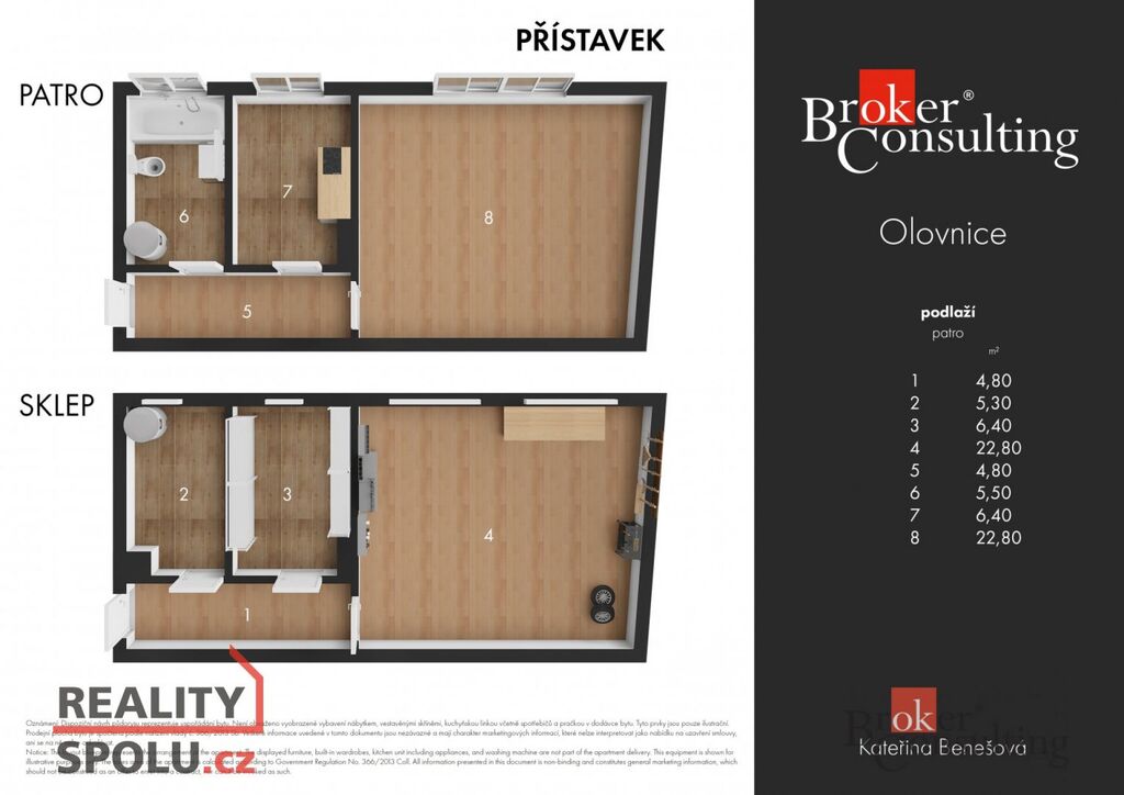 Dispozičně je dům řešený jako 2+1 v přízemí a 3+1 v patře, s prostorným balkonem orientovaným do dvora. Obě bytové jednotky je možné propojit nebo oddělit (včetně samostatného vchodu pro každou bytovou jednotku zvlášť). Všechny pokoje jsou velmi světlé, orientované na jih. V domě je mnoho úložných prostor.