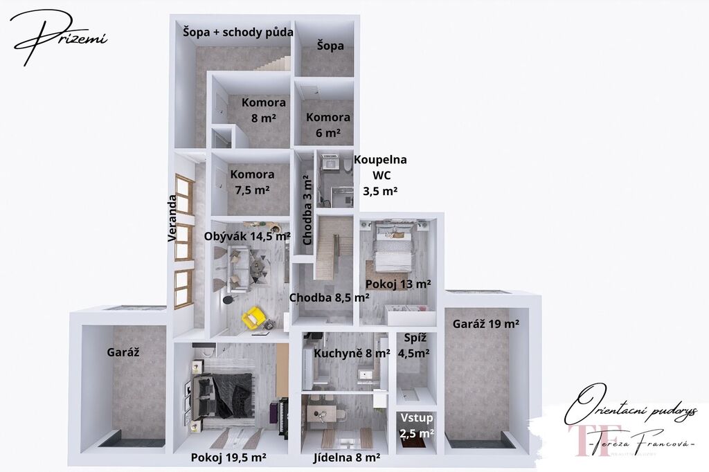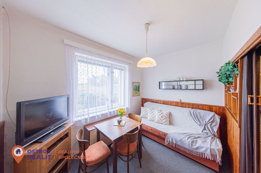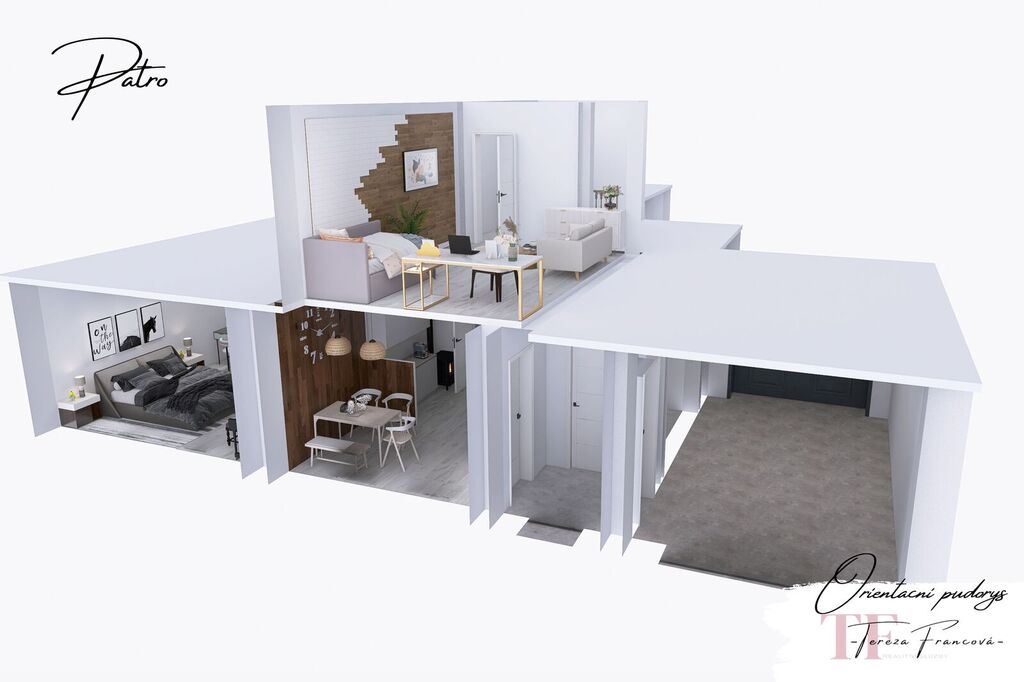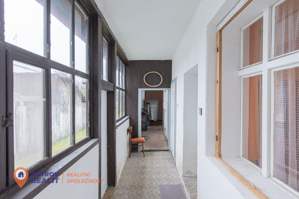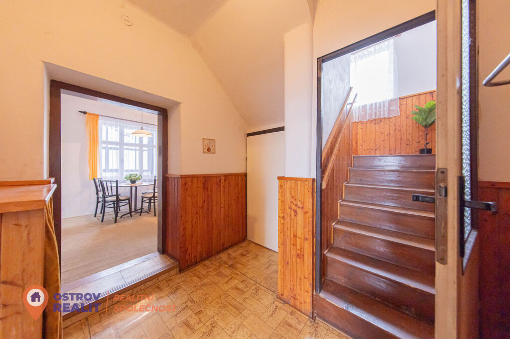 Po vstupu do domu vás přivítá menší předsíň, z níž je přímý vstup do garáže, kde můžete pohodlně zaparkovat. Z předsíně se dostanete také do spíže, která nabízí možnost přestavby na další koupelnu. Centrální chodba vás zavede do prostorné jídelny s praktickou kuchyňskou linkou, navazující na pokoj s výhledem na zahradu a dále na chodbu se stylovým dřevěným schodištěm do obytného patra, kde najdete prostorný pokoj s nádherným výhledem do okolní krajiny. V přízemí se také nachází samostatný pokoj a průchozí pokoj vedoucí na prosklenou verandu, kde si můžete vytvořit zimní zahradu nebo relaxační kout. Koupelna se sprchovým koutem a WC je umístěna u schodiště, poblíž dalších praktických místností využitelných jako komory nebo dílna.
