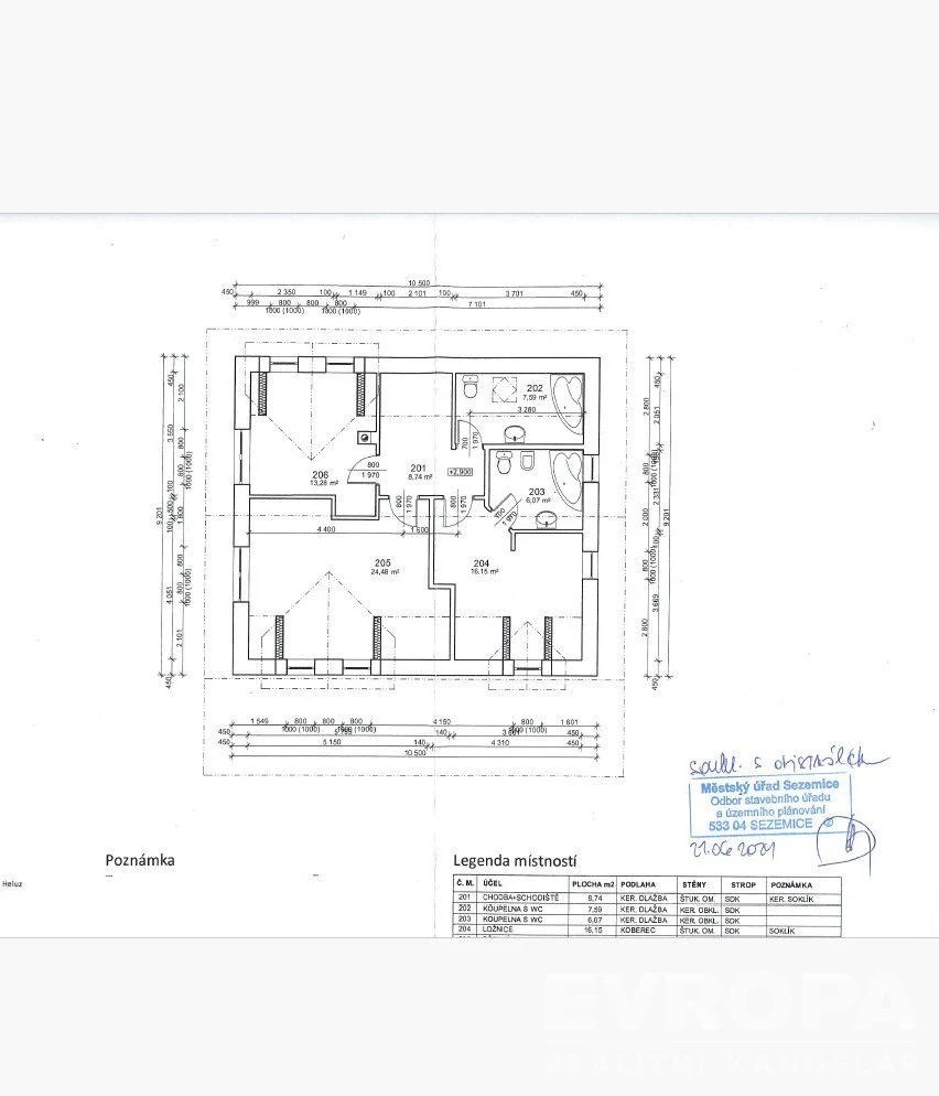 1. NP: předsíň, velký obývací pokoj s kuchyňským koutem a vstupy na terasu, menší pokoj, technická místnost, koupelna, toaleta .