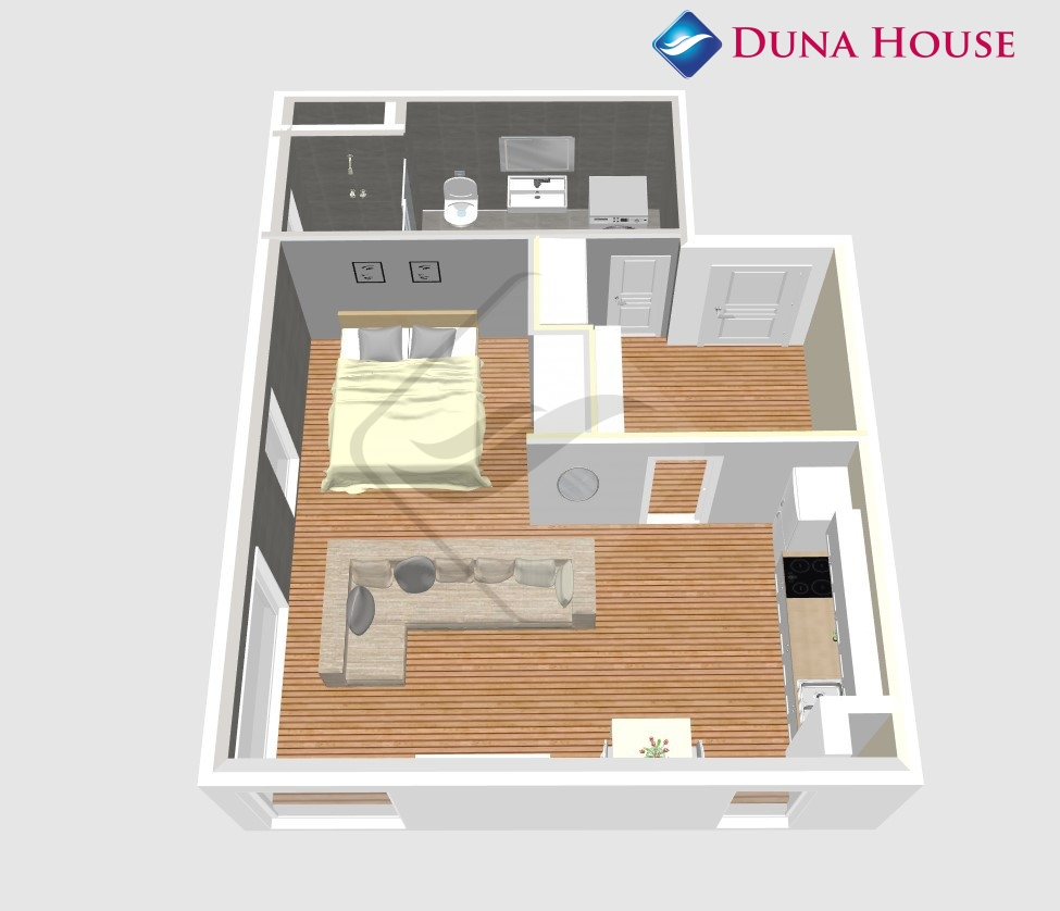 Je řešena vstupní předsíní, koupelnou se sprchovým koutem a toaletou, obývací částí s kuchyňským koutem a koutem na spaní, který se dá případně úplně oddělit.