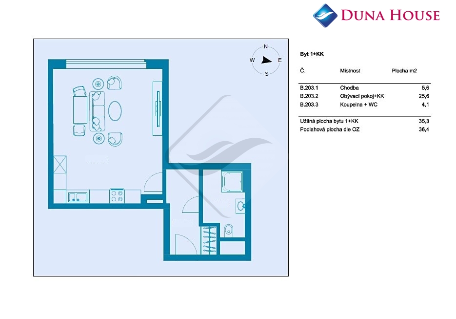 Byt 1+kk, 36,4 m2 velký, sestávající ze vstupní předsíně, koupelny s toaletou a prostorného pokoje s kuchyňským koutem, je situovaný v 1. NP nového viladomu.