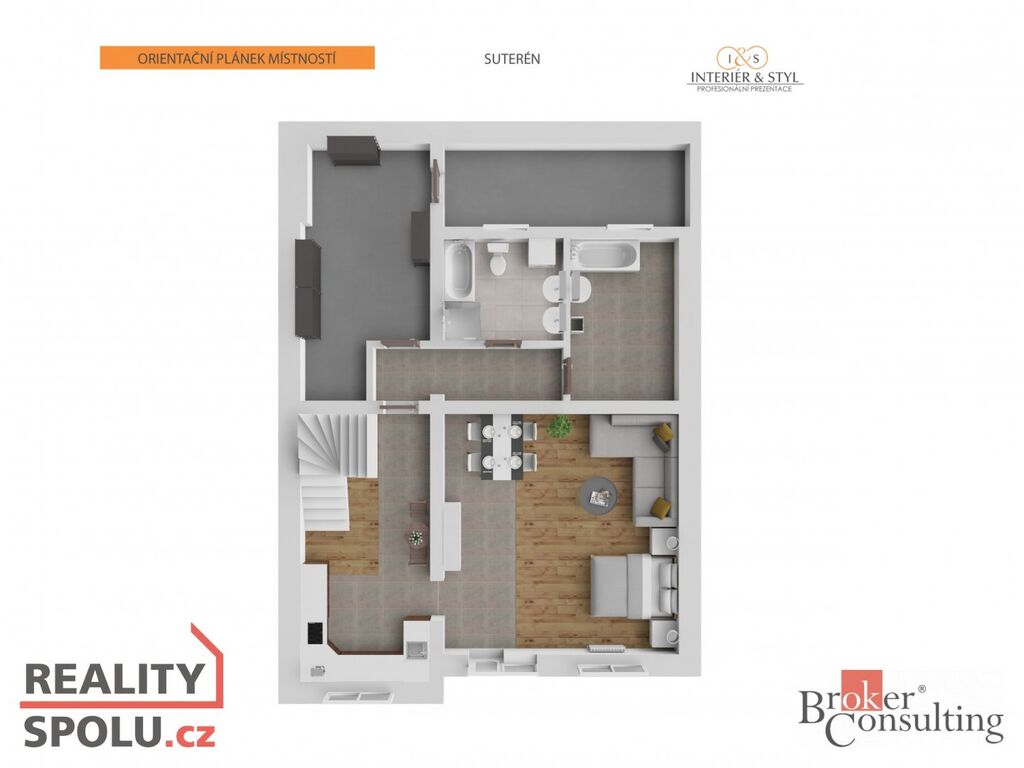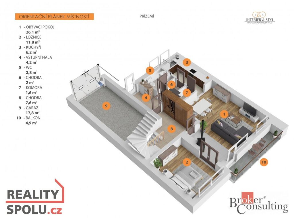 Vstup z ulice, kde je i garáž a kryté parkovací stání, je do II. NP, kde se nachází předsíň, samostatné WC s umyvadlem, kuchyň, komora, obývací pokoj se vstupem na balkón a ložnice. Z předsíně je vstup do obytné části nebo na centrální schodiště, kudy můžete jít dále do I. NP nebo do obytného podkroví. V obytném podkroví se nachází 3 pokoje a koupelna s WC.