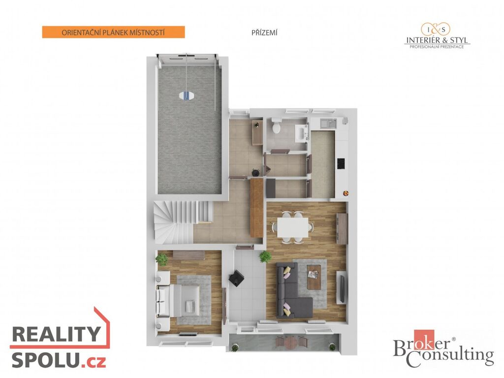 V I. NP je velký obývací pokoj s kuchyňským koutem, WC a další prostory. Z obývacího pokoje v I. NP je vstup terasu na oploceném pozemku, kde je udržovaná zahrada a bazén se zastřešením pro případ špatného počasí. Součástí bazénu je filtrace a solární systém na vyhřívání vody v bazénu.