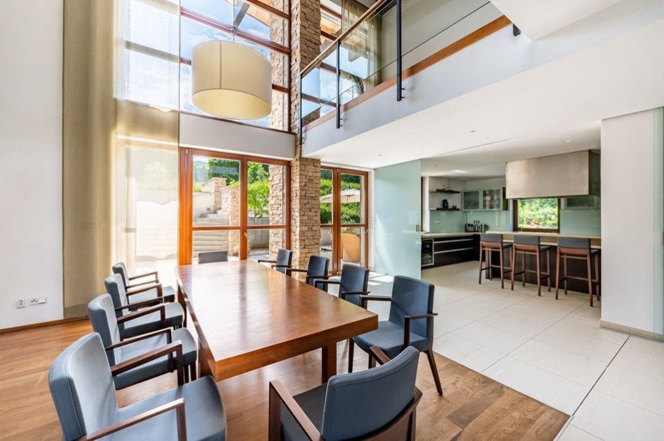 Prosluněný interiér skýtá dvě podlaží a suterén, 10 ložnic s en-suite koupelnami i walk-in šatnu do hlavní ložnice, zajímavě řešenou kuchyni která má prosklenou posuvnou stěnu, otevřený a velkorysý koncept obývacího pokoje a jeho propojení se zahradní terasou s neopakovatelnými výhledy na panorama Prahy a následně přímý výstup do zahrady na letní, slunící se terasu s bazénem. Nechybí samozřejmě nezbytné technické a provozní zázemí včetně prádelny s výstupem do zahrady.