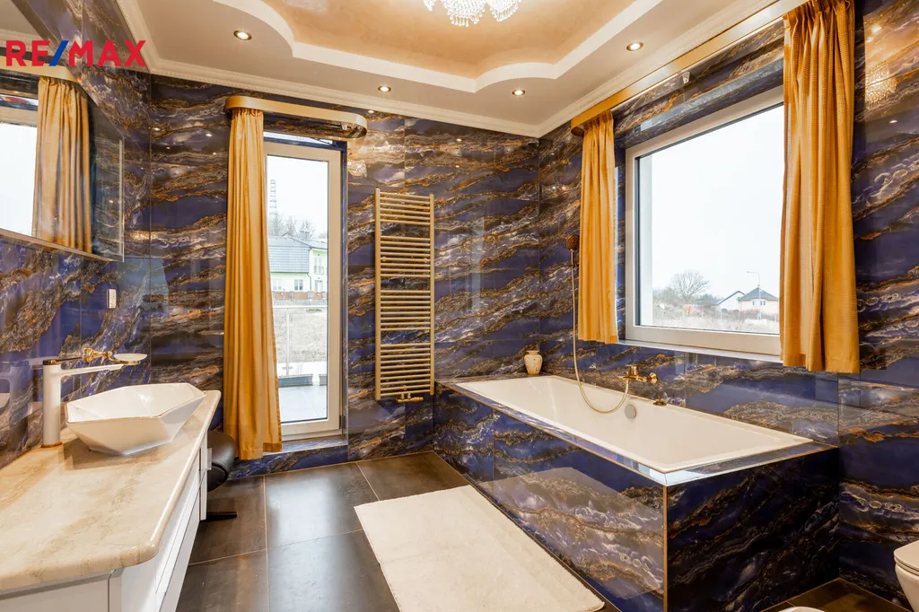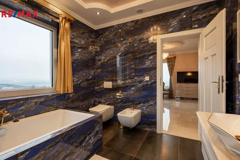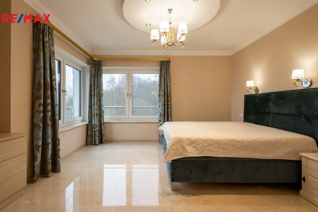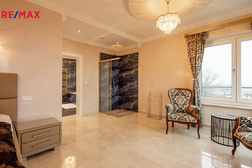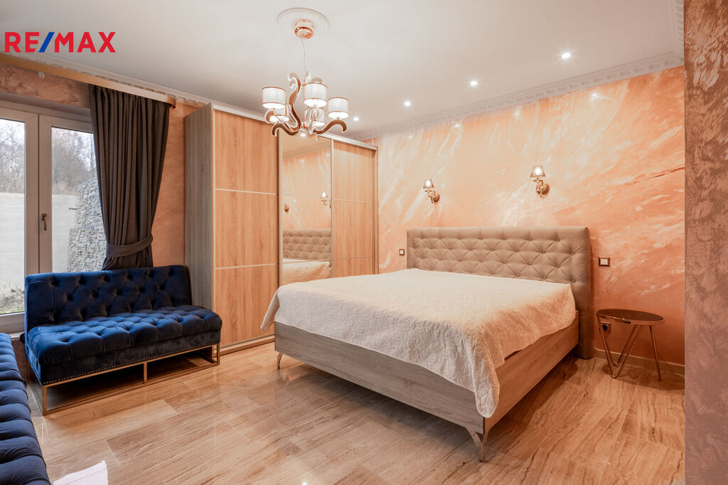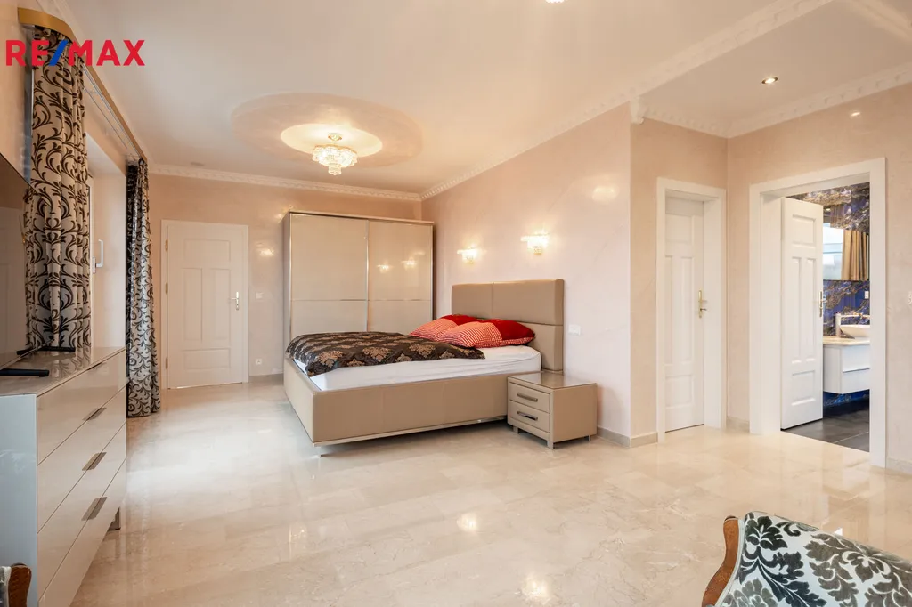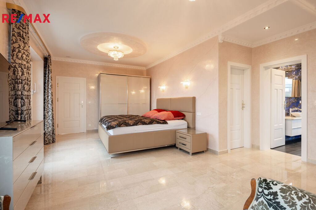 První patro je soukromou zónou domu. Hlavní ložnice s vlastní koupelnou a šatnou vám zajistí maximální komfort. Z prostorného balkonu, který je přístupný z hlavní obývací části, si můžete vychutnat klidné chvíle s výhledem na Karlovy Vary a hory.