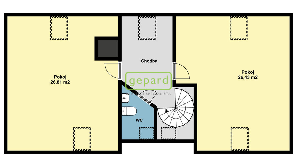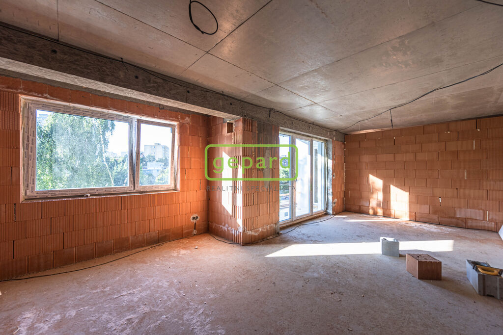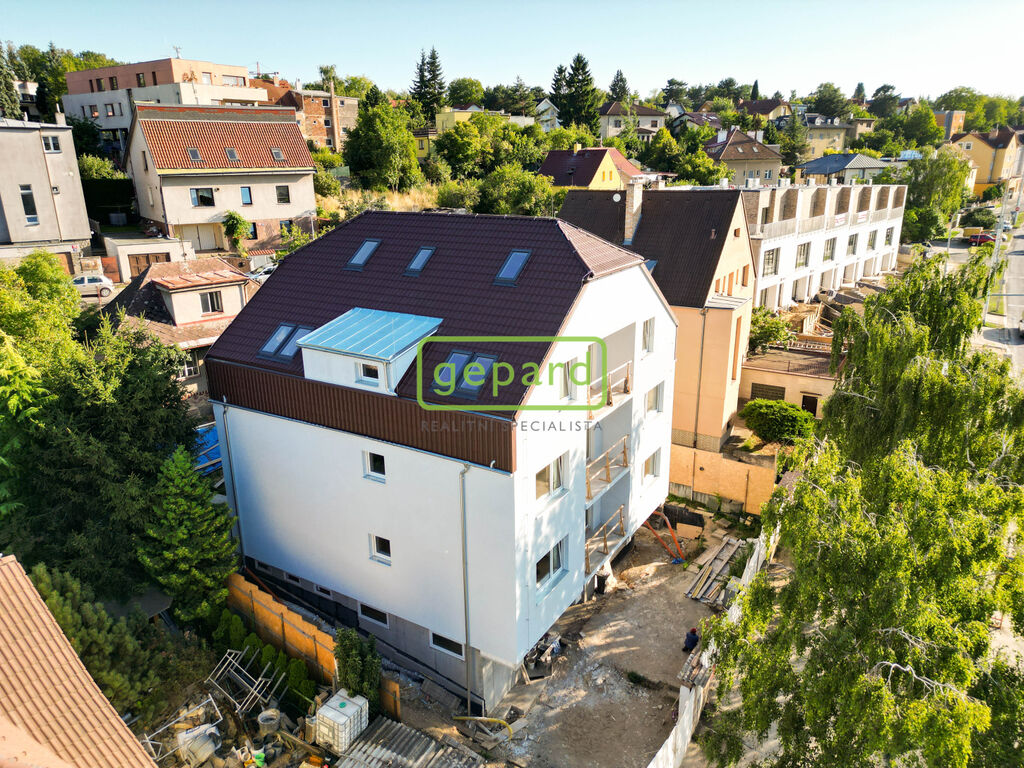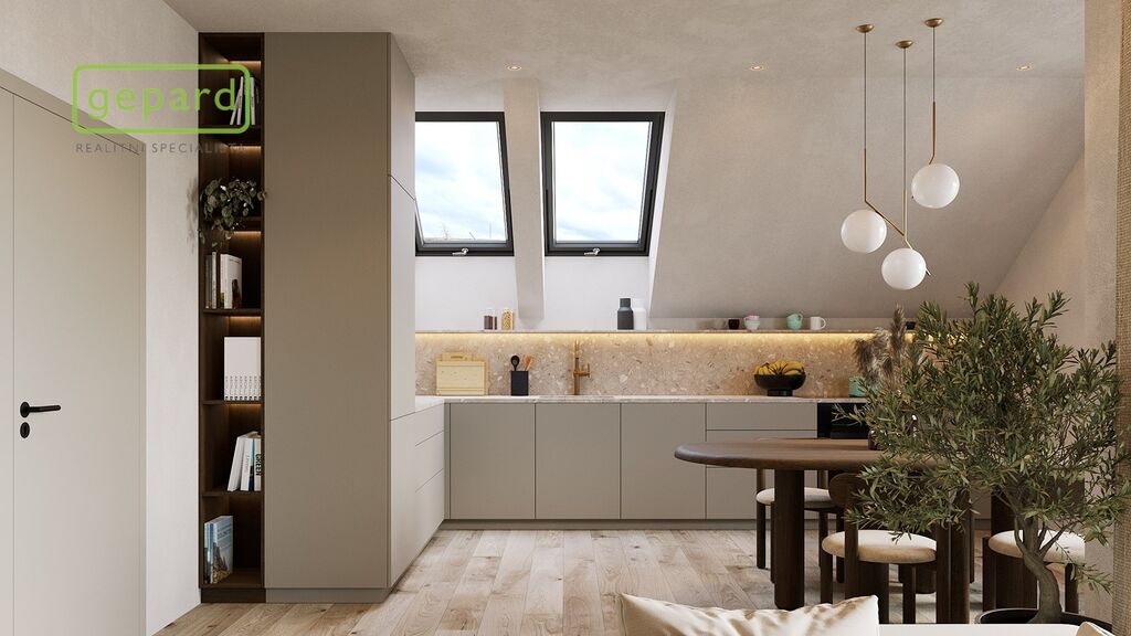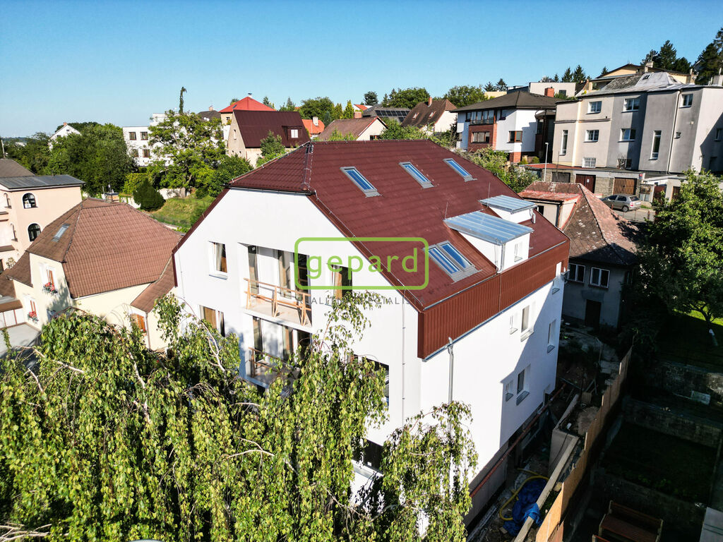 Realitní společnost Gepard nabízí byt 6+kk o velikosti 160m2, balkon 9,7m2 se vstupem ze dvou pokojů a druhý balkon 6,2m2 se vstupem z obývacího pokoje, podkrovní pokoj o velikosti 48m2 s koupelnou společnou s WC se nachází ve 4.NP a je z bytu přístupný po schodišti umístěném na chodbě. K bytu náleží 2x garážové stání, sklep 2,8m2 (přístup z garáže), 1x venkovní parkovací stání na pozemku, komora na patře.