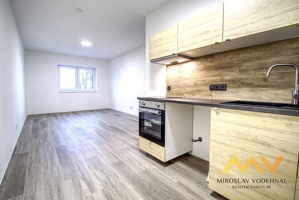 Byt disponuje praktickou dispozicí, která zahrnuje obývací pokoj s moderním kuchyňským koutem, samostatnou ložnici, koupelnu s toaletou a předsíň. Kuchyňská linka je vybavena indukční varnou deskou, elektrickou troubou a odsavačem par, přičemž je připraven prostor pro myčku a lednici. V koupelně najdete sprchový kout, toaletu, umyvadlo a přípojku na pračku nebo sušičku.