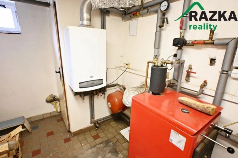 Dům je celý podsklepený, kde najdete vytápěnou garáž s ponkem, 2 prostorné vytápěné místnosti, 2 studené místnosti s regály, kotelnu se závěsným plynovým kotlem Baxi, kotlem na tuhá paliva Dakon a kombinovaným ohřívačem vody OKC 160NTR/BP Dražice. Vedle kotelny je místnost sloužící ke skladování tuhých paliv. Rozvody do radiátorů jsou v mědi.