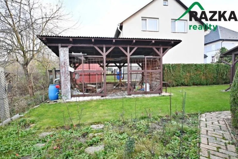 Na pozemku je zastřešené parkovací stání a další dřevěný přístřešek, který sloužil ke skladování dřeva.