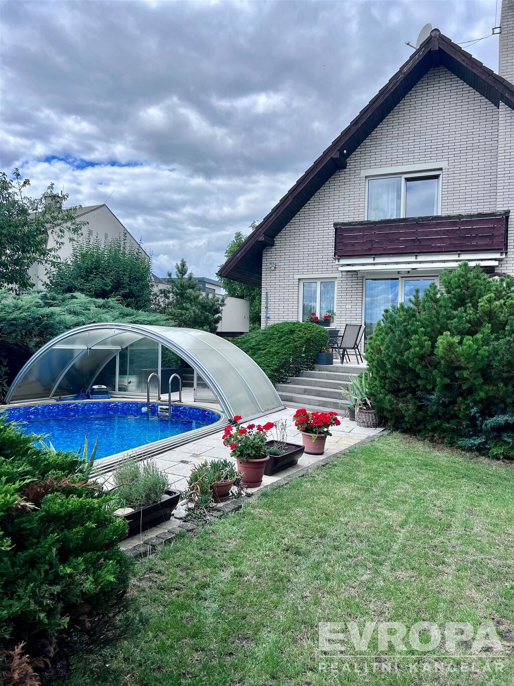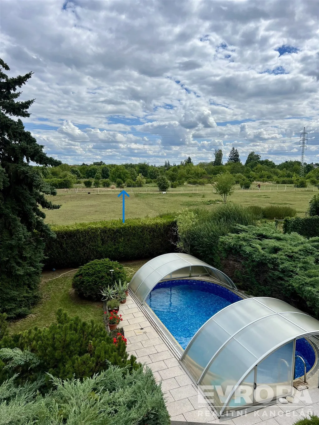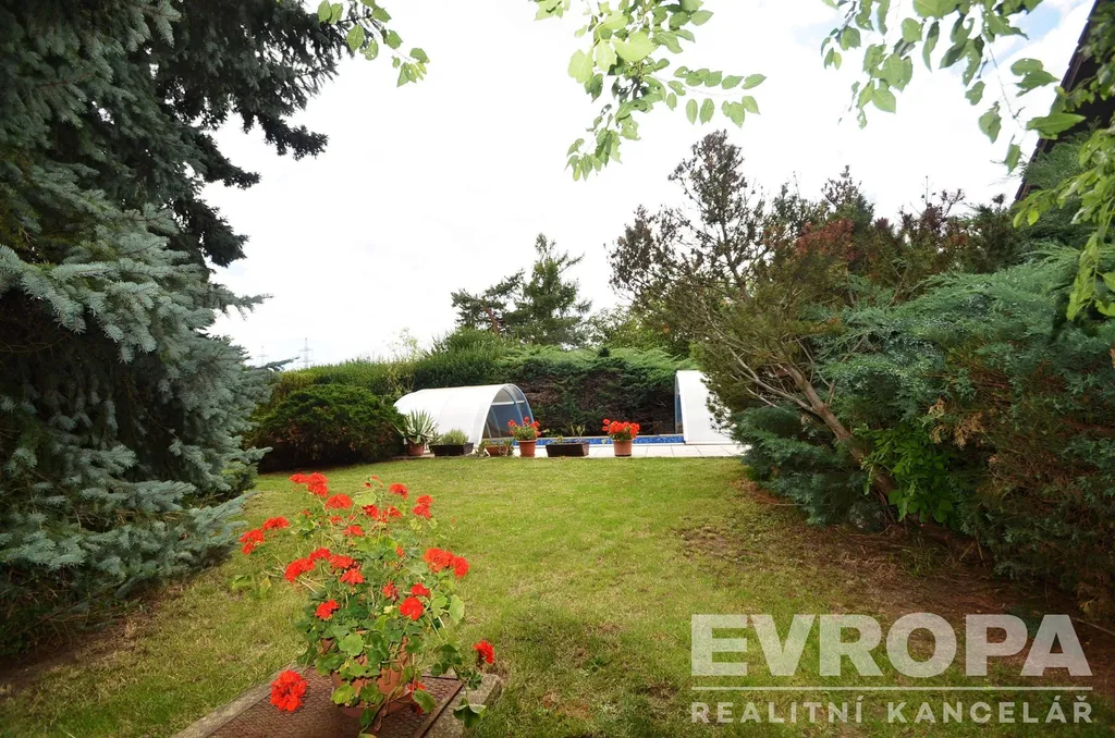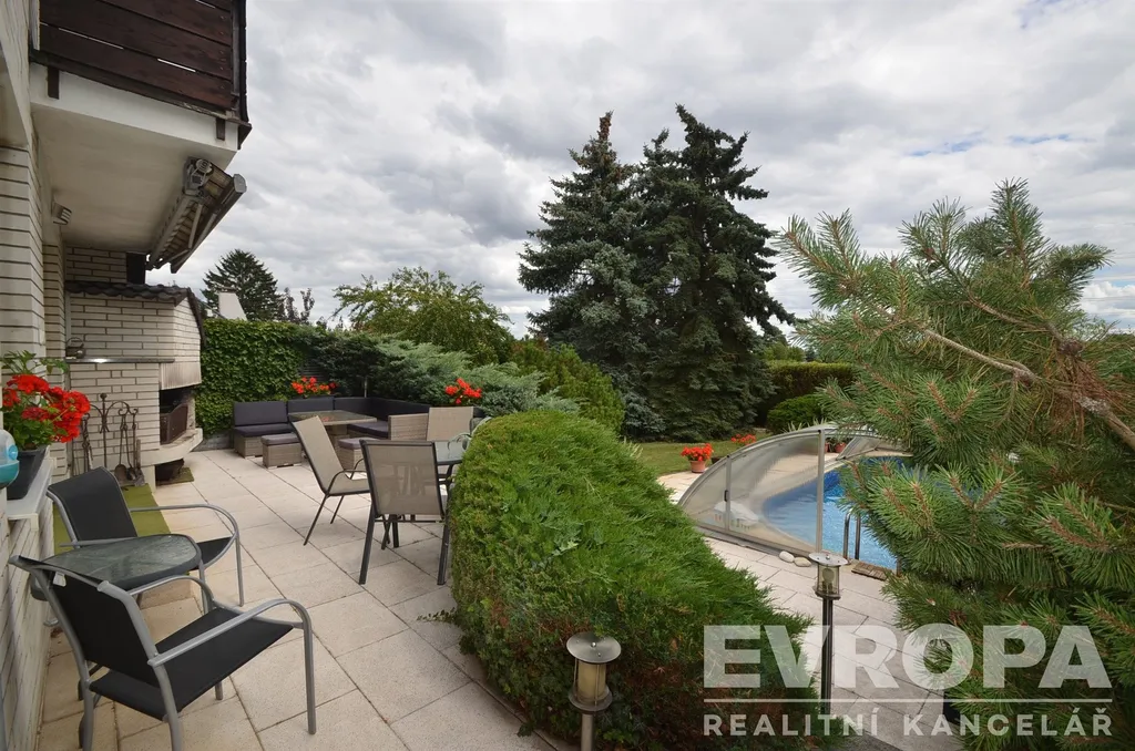 Vzrostlá zeleň v zahradě zajišťuje dostatek soukromí, milou atmosféru dotváří venkovní krb, maximum komfortu potom vyhřívaný bazén se zastřešením.