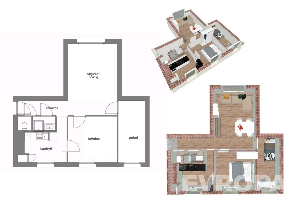 Dispozice 3+1 zahrnuje vstupní chodbu, obývací pokoj, ložnici, dětský pokoj, dále samostatnou kuchyň a oddělenou koupelnu a WC.