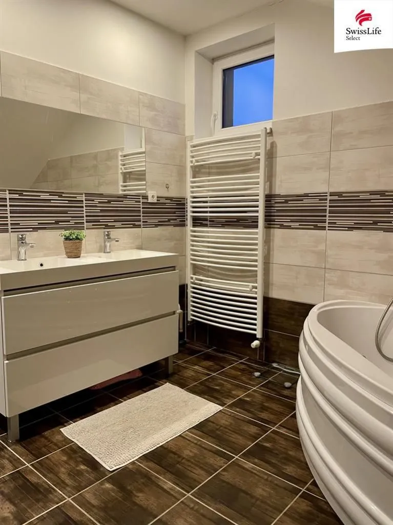 V patře je také moc pěkná koupelna a samostatná toaleta. Obojí opět v decentních barvách. Dvě umyvadla a vana se zajímavým designovým prvkem dělají z místnosti příjemnou oázu.