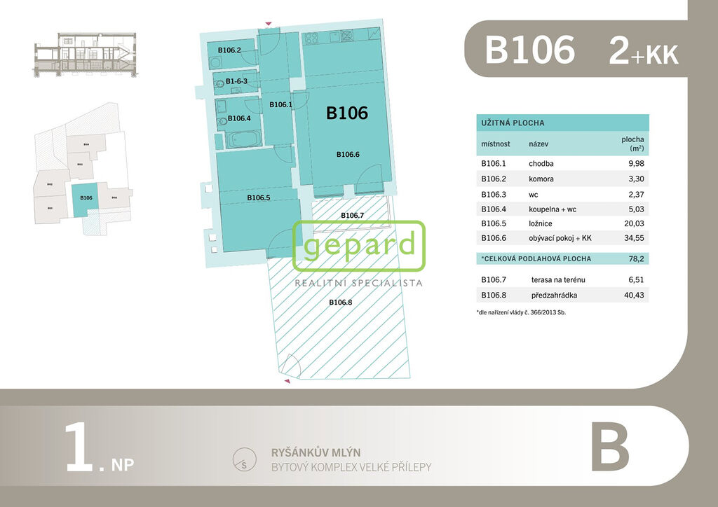 Realitní společnost Gepard nabízí k prodeji byt v OV 2+kk, 58m2, se zahradou 47m2 (byt č. B106), komorou v bytě a sklepní kójí v developerském projektu Ryšánkův mlýn ve Velkých Přílepech vzdálených od Prahy pouhých 6km a 15min autem.