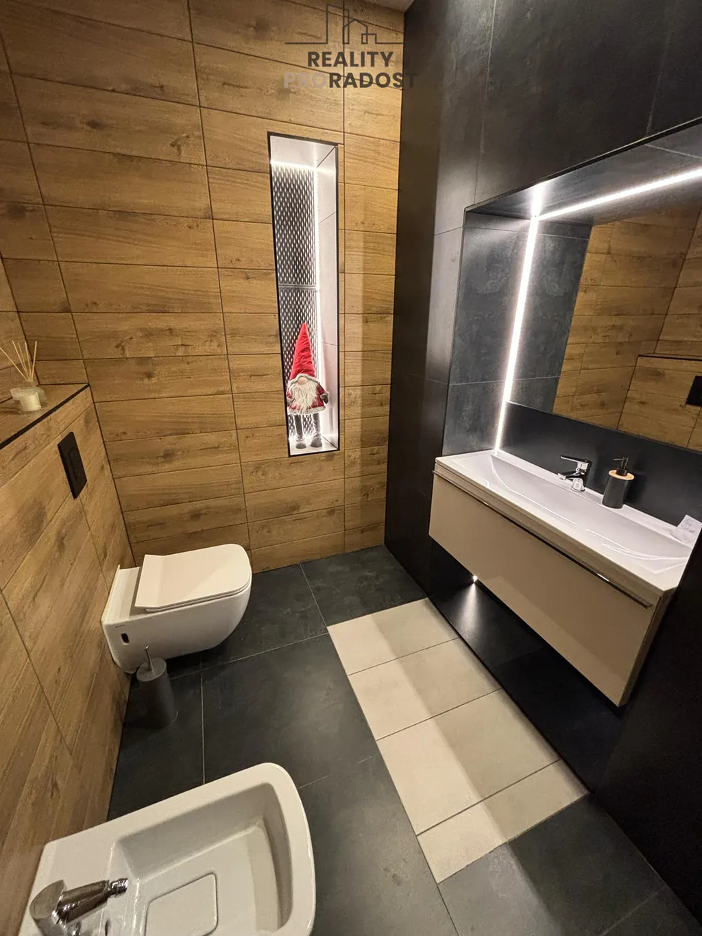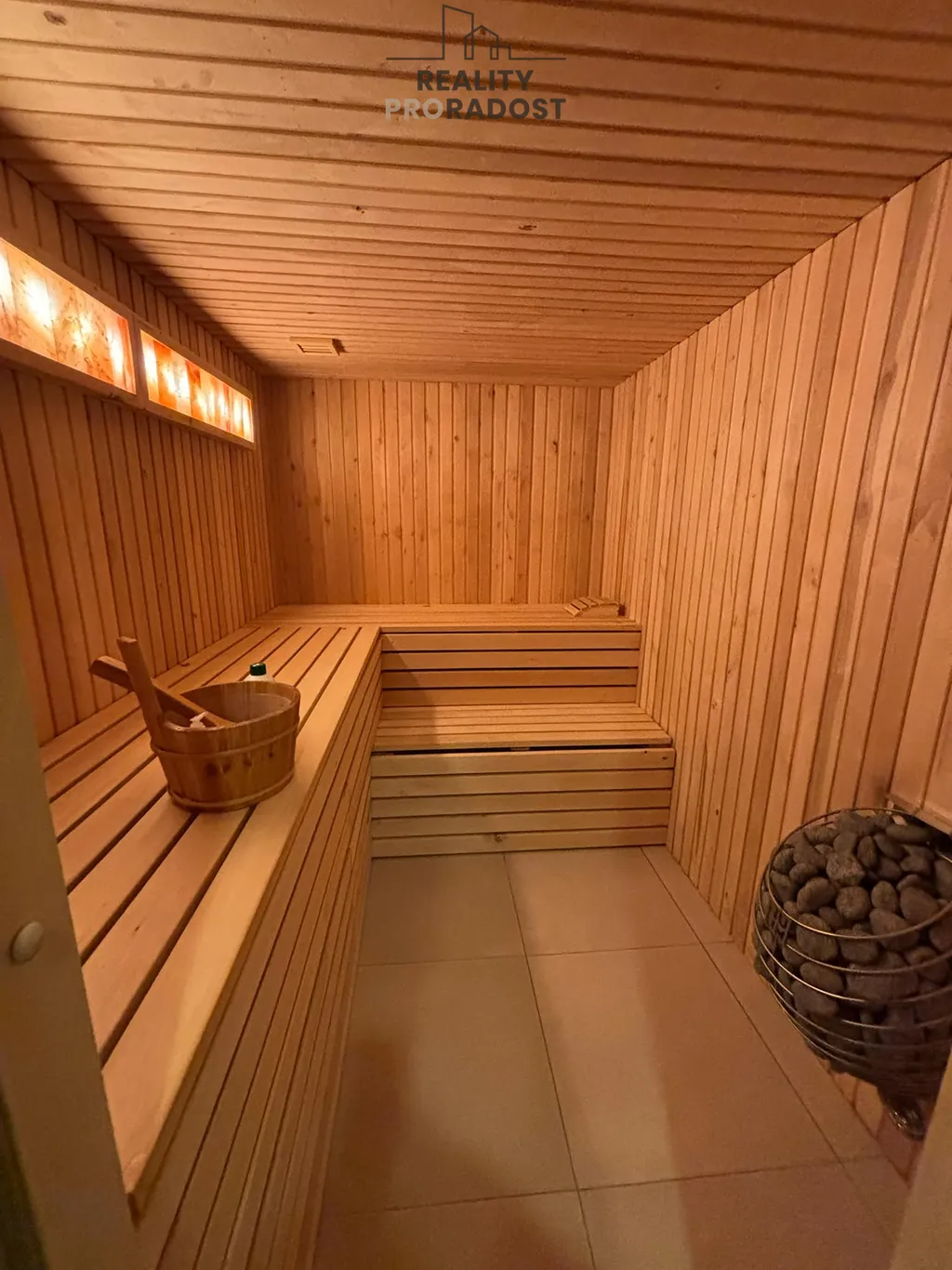 Dále v penzionu máme jeden společenský apartmán, který disponuje svojí kompletně zařízenou kuchyní, obývacím prostorem a společenským prostorem s barem. Tuto společenskou část využijete ke sledování různých sportovních akcí, místnost pro děti jako hernu či jen ke společnému strávenému času s ostatními. Z tohoto apartmánu máme zajištěný vstup do Finské sauny s himalájskou solí která je navržena pro co nejvíce záporných (zdraví prospěšných) iontů a odpočinkové místnosti se sprchou. Samostatné wc s bidetem je umístěno na chodbě.