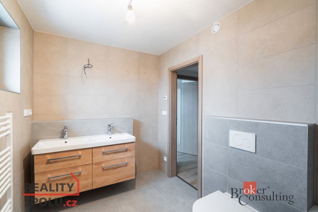Jedná se o zděnou stavbu (Ytong) se dvěma nadzemními podlažími. Tato novostavba o dispozici 5+kk se nachází na pozemku o rozloze 665 m2, přičemž celková plocha domu činí 164,8 m2. V přízemí se nachází prostorný obývací pokoj spojený s kuchyní (41,1 m2) a vstupem na terasu (40 m2), dále je zde místnost, která může sloužit jako pokoj pro hosty či pracovna (11,8 m2), koupelna se záchodem (4,6 m2), technická místnost (2,9 m2) a ještě jedna menší místnost pod schody (4,0 m2). V prvním patře jsou dva pokoje s vlastní šatnou (17,8 m2 a 16,0 m2), dále ložnice (16,0 m2) se samostatnou šatnou (3,0 m2) přes chodbu a také druhá koupelna (6,1 m2). Jistě také oceníte pudní prostor o velikosti cca 40 m2.
